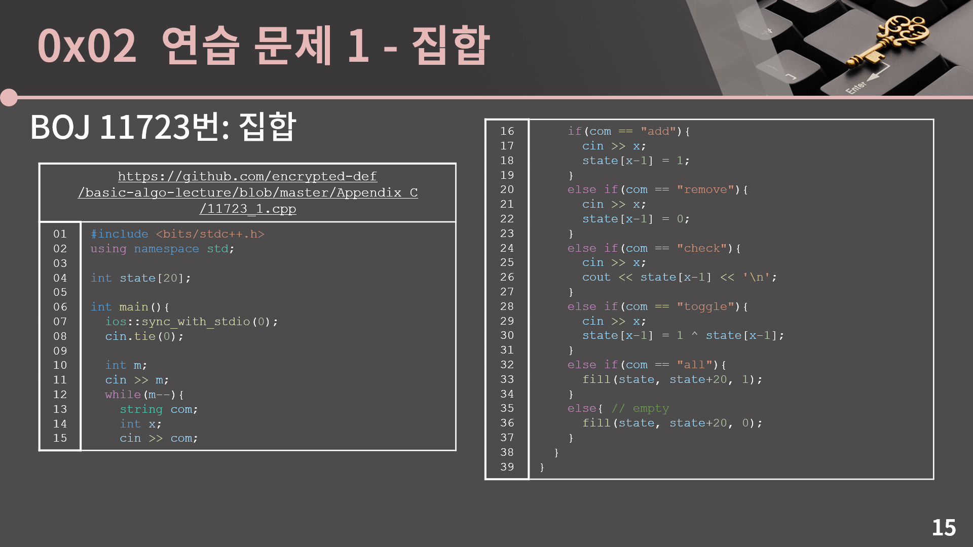 상태를 0으로 만들면 바로 끝입니다. 이렇게 되면 20번 대입 연산을 하던걸 딱 1번의 대입 연산으로 해결할 수 있습니다. 즉 all과 empty 명령을 20배 더 빠르게 할 수 있게됩니다. 그래서 state를 배열이 아니라 int 1개로 두고 각 비트에 적절하게 비트연산을 수행해서 문제를 푸는 비트마스킹 기법으로 코드를 짜보겠습니다.