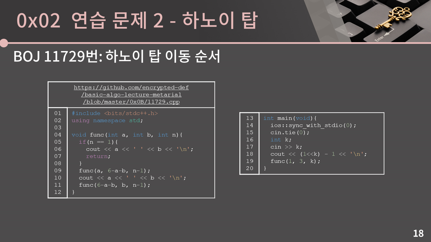 코드를 같이 보겠습니다. 앞의 슬라이드에서 부분 부분 쪼개 설명을 다 했어서 크게 다시 설명할 부분은 없는데 다만 18번째 줄에서 (1<<k)가 조금 어색할 수 있겠다 싶습니다. << 이건 left shift라고 불리는 비트 연산자인데 1을 비트 기준 왼쪽으로 k칸 밀어라는 의미이기 때문에 (1<<k)는 2k가 됩니다.