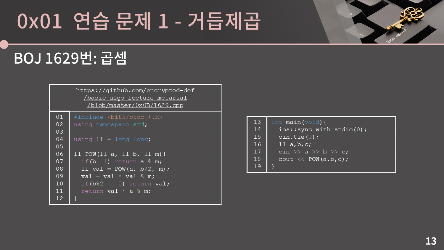 이 함수의 시간복잡도는 b가 계속 절반씩 깎이기 때문에 O(log b)입니다. 그래서 문제의 시간 제한을 아주 넉넉하게 지킬 수 있습니다. 만약 직접 짜서 냈는데 틀렸거나 시간 초과가 발생했다면 int overflow가 발생했거나, POW 함수 내에서 POW 함수를 1번 부르는게 아니라 2번 불러서 시간복잡도가 O(log b)가 아닌 O(b)가 됐거나, base condition을 빼먹었거나 하는 이유 등을 짐작해볼 수 있습니다.