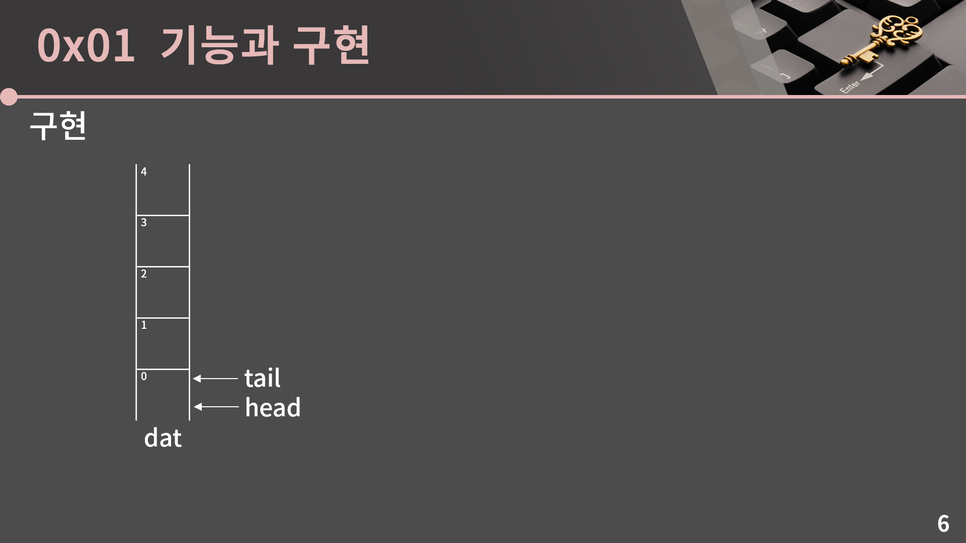 앞의 과정을 보면 push를 할 땐 tail이 증가하고, pop을 할 땐 head가 증가합니다. 그렇기 때문에 dat 배열에서 큐의 원소들이 들어있는 장소는 점점 오른쪽으로 밀립니다.