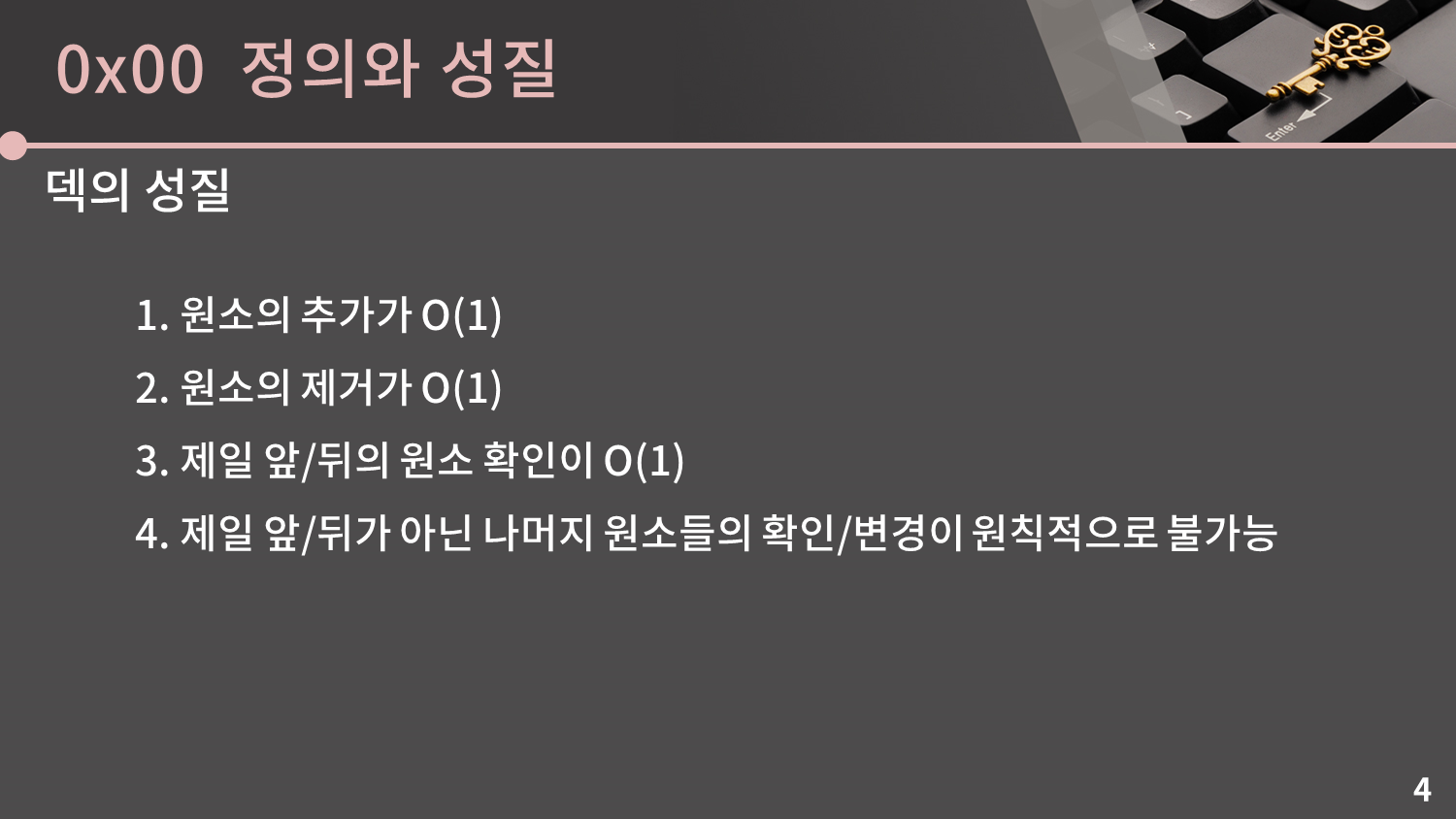 덱에서도 삽입, 삭제, 제일 앞/뒤 원소의 확인이 다 O(1)입니다. 그리고 제일 앞/뒤가 아닌 나머지 원소들의 확인/변경이 원칙적으로 불가능한데 독특하게도 STL deque에서는 인덱스로 원소에 접근할 수 있습니다. STL stack, queue에서 불가능했던걸 생각하면 꽤 독특한 일입니다.