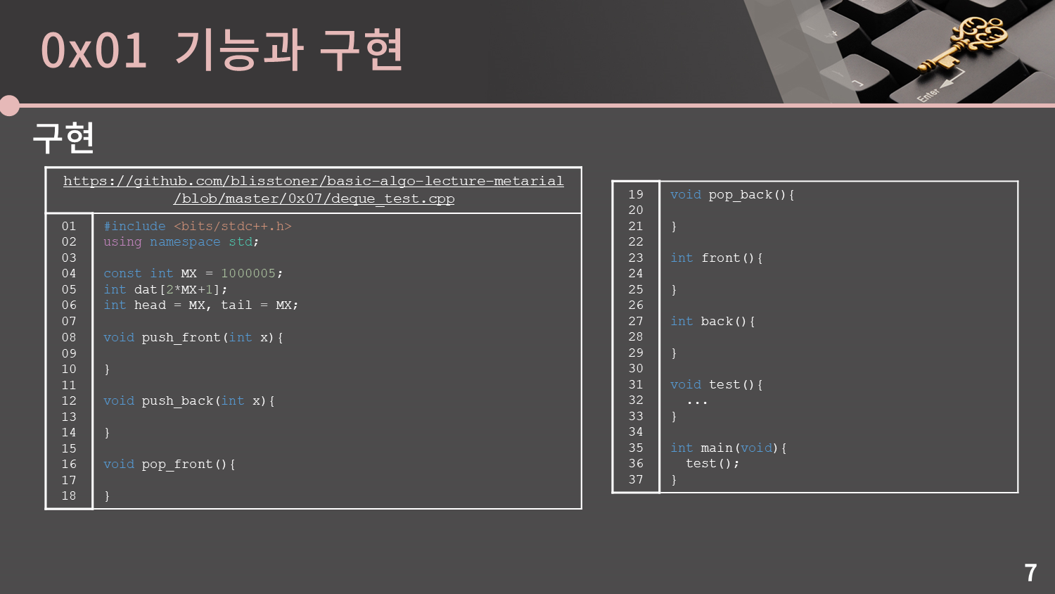 설령 앞의 스택과 큐 강의는 직접 구현을 하지 않고 그냥 슬라이드에 적힌 코드를 눈으로 본게 다라고 하더라도, 이번 덱만큼은 연습을 하는 차원에서 꼭 직접 짜봤으면 좋겠습니다. 스택과 큐를 구현했던 그 느낌을 가지고 배열의 어디에 값을 넣어야 하고 어떤걸 반환해줘야 하는지 잘 생각해보면 크게 어렵지는 않을 것입니다.(템플릿 링크)