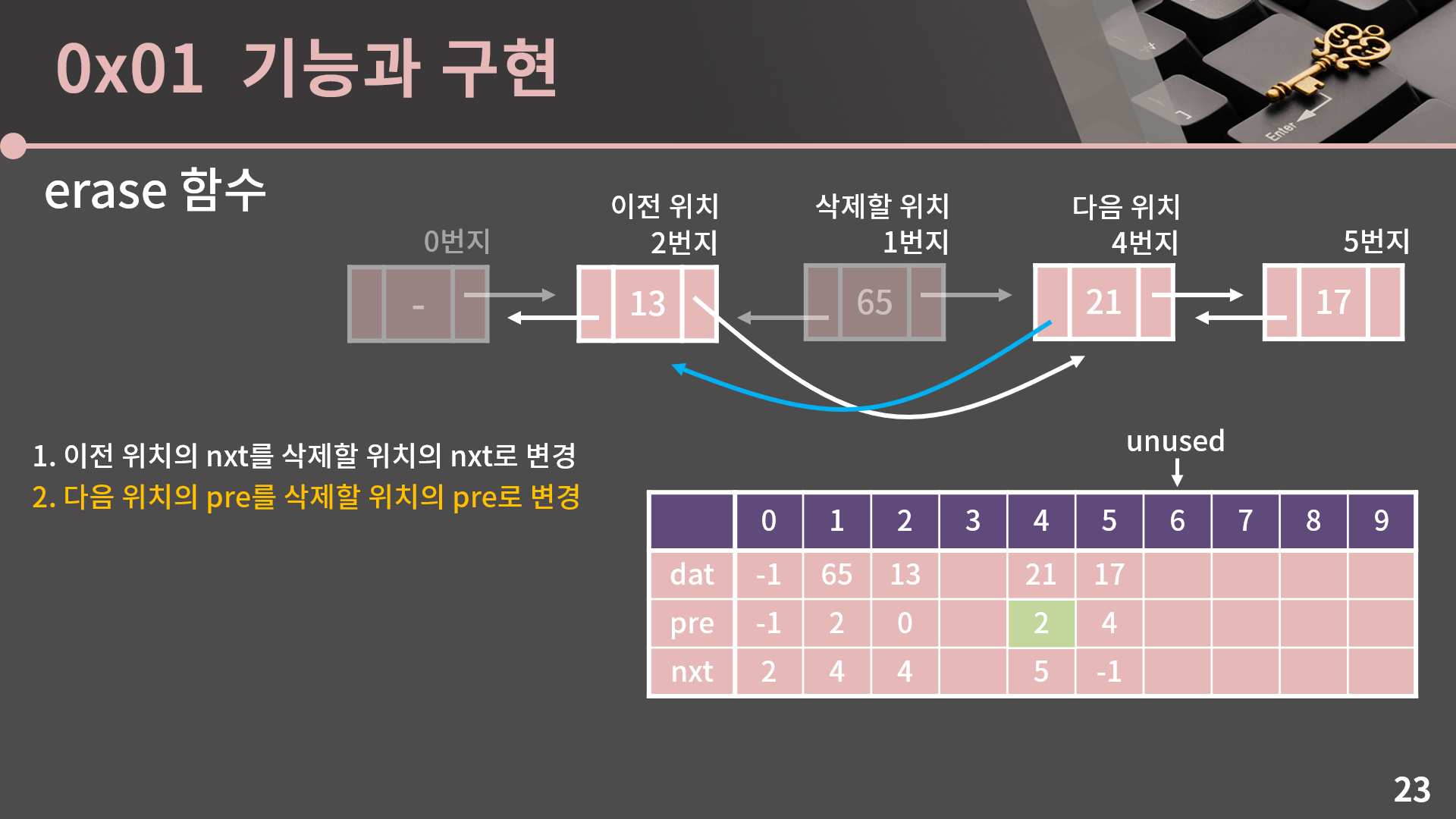 이런 상황이니까 굳이 dat, nxt, pre 값을 -1과 같은 다른 값으로 덮을 필요가 없고 그냥 내버려두면 됩니다. 대신 이러한 구현 방법 때문에 이 야매 연결 리스트에서는 제거된 원소가 프로그램이 종료될 때 까지 메모리를 점유하고 있게 되고, 그렇기에 실무에서는 사용할 수 없는 구현 방식입니다.