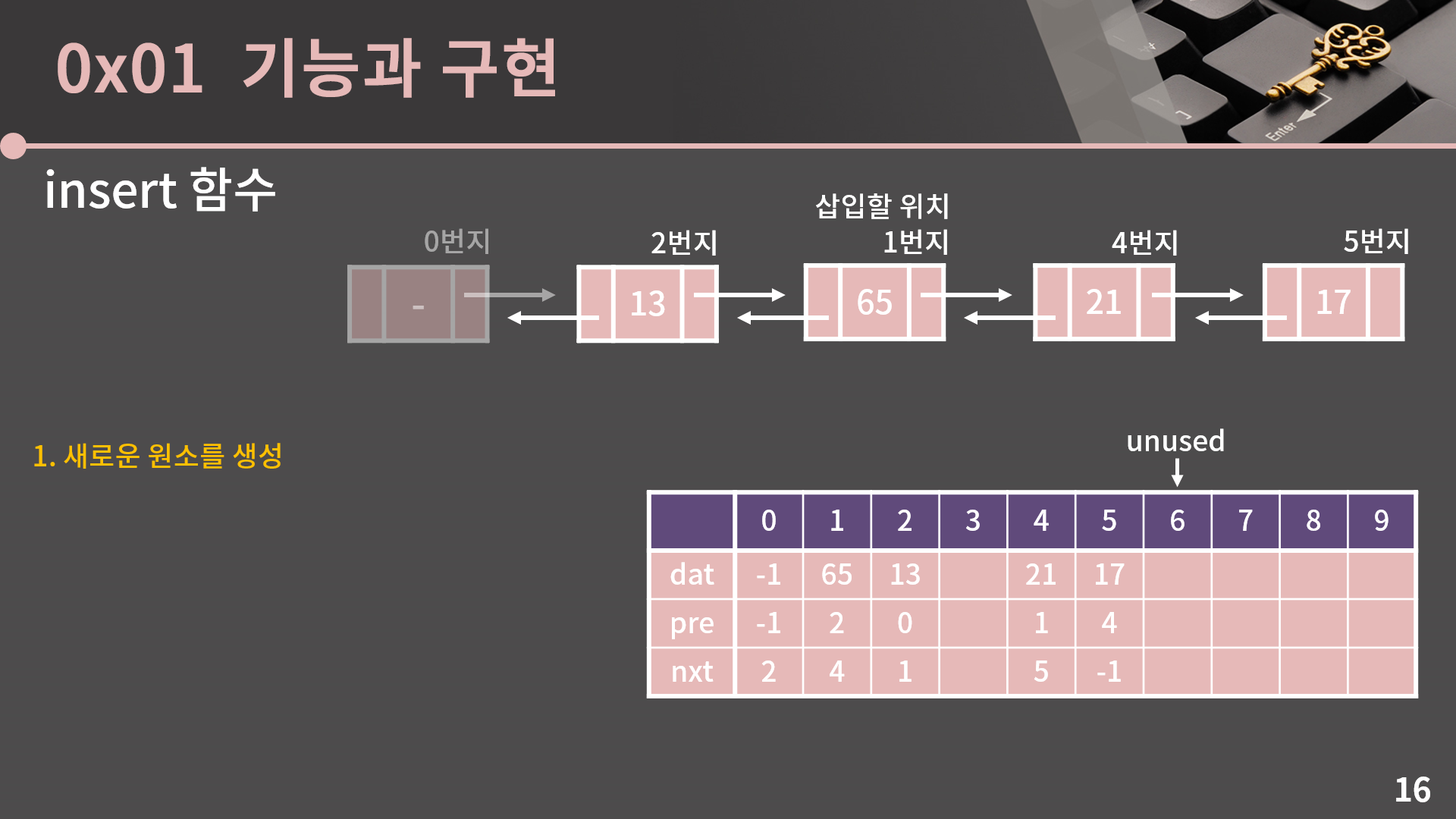 구현에 필요한 변수들을 보면 dat[i]는 i번지 원소의 값, pre[i]는 i번지 원소에 대해 이전 원소의 인덱스, nxt[i]는 다음 원소의 인덱스입니다. pre나 nxt의 값이 -1이면 해당 원소의 이전/다음 원소가 존재하지 않는다는 의미입니다. unused는 현재 사용되지 않는 인덱스, 즉 새로운 원소가 들어갈 수 있는 인덱스이고 원소가 추가된 이후에는 1씩 증가될 것입니다. 그리고 특별히 0번지는 연결 리스트의 시작 원소로 고정되어 있습니다. 달리 말하면 0번지는 값이 들어가지 않고 단지 시작점을 나타내기 위한 dummy node입니다.