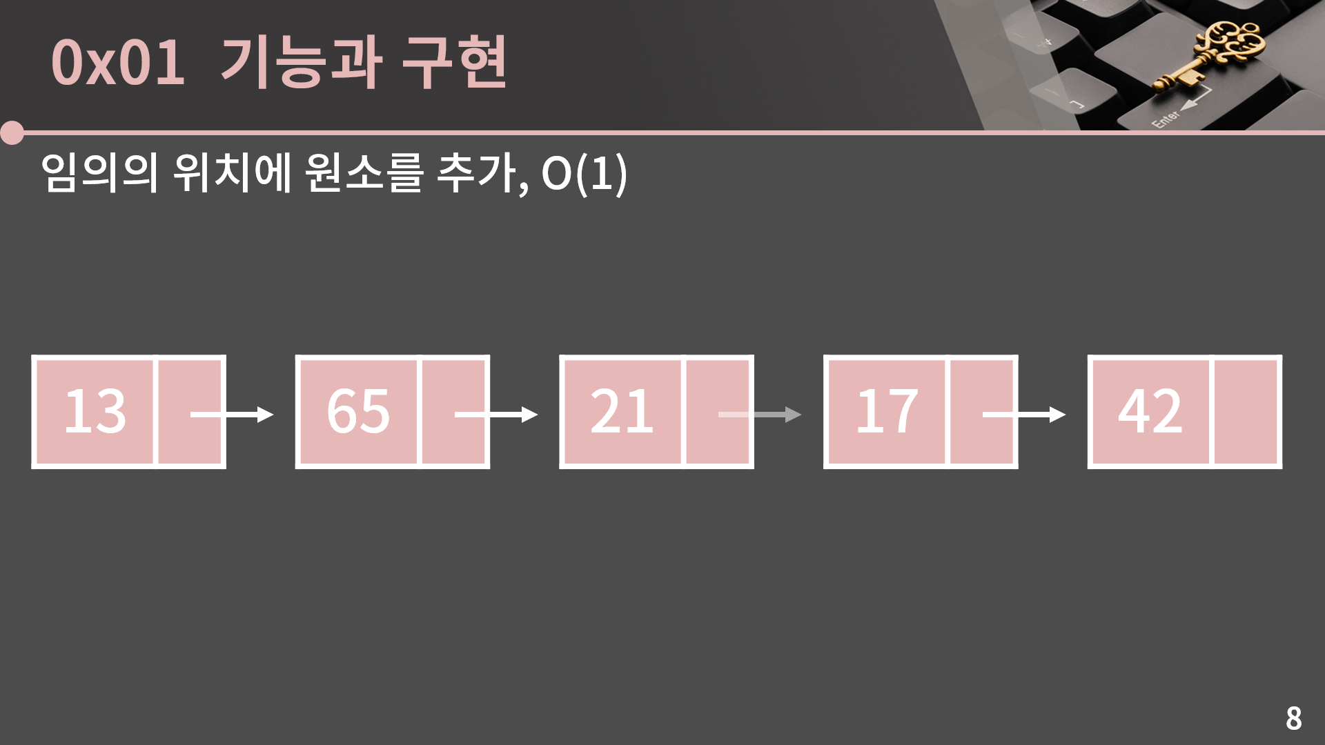 두 번째로 임의의 위치에 원소를 추가하는 연산인데, 이건 O(1)에 가능합니다. 왜냐하면, 예를 들어 21 뒤에 84를 추가하고 싶다고 할 때, 배열처럼 그 뒤의 원소들을 전부 옮기는 작업을 할 필요가 없고 그냥 21과 84에서 다음 원소의 주소만 변경을 해주면 되기 때문에 그렇습니다.