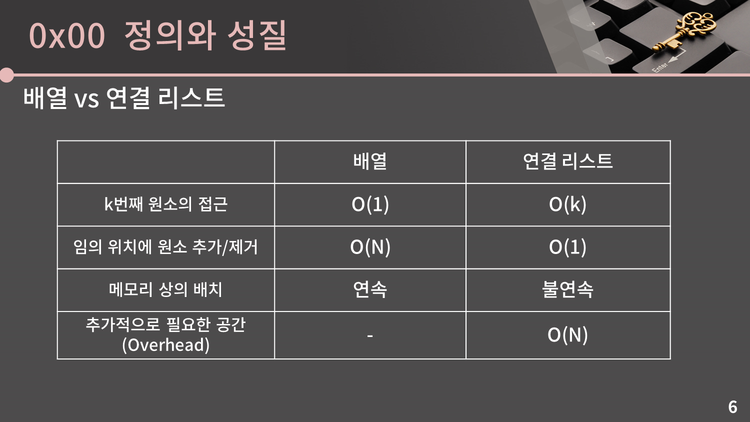 첫 번째로 k번째 원소의 접근은 배열의 경우 O(1), 연결 리스트의 경우 O(k)입니다.