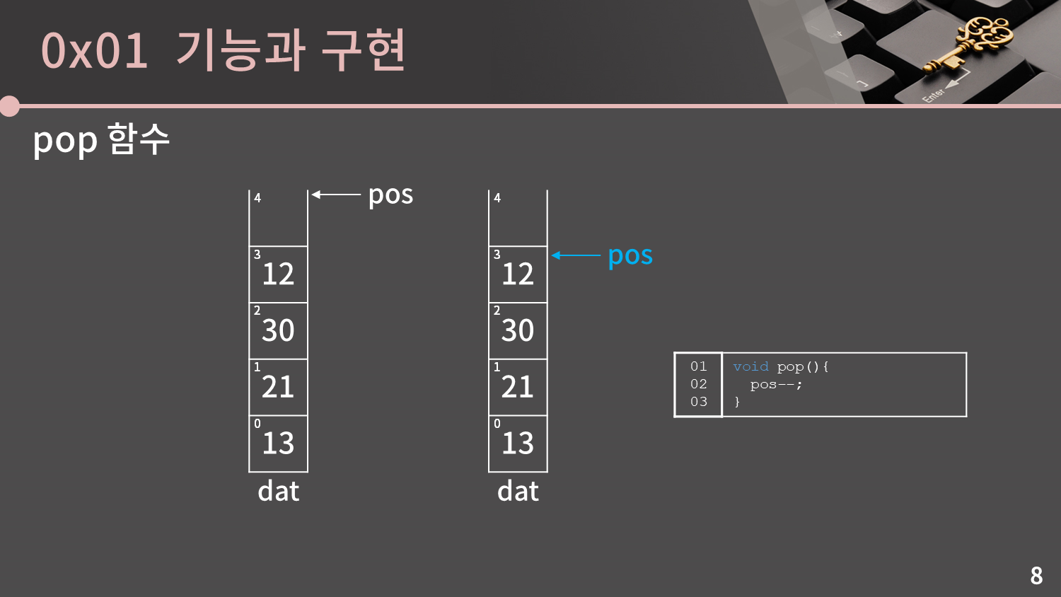 그 다음으로는 꼭대기에 있는 12를 빼보겠습니다. 12를 빼려면 딱 1개만 하면 되는데 그냥 pos를 1 줄이면 됩니다. 이 때 dat의 3번지에 있는 값 12 자체는 굳이 변경하지 않아도 괜찮습니다. 왜냐하면 나중에 push가 발생하면 어차피 그 때 들어올 값으로 덮어써질거라 더 이상 저 12라는 값은 아무 의미가 없고, 이런 상황이면 굳이 값을 변경하는 추가적인 연산을 하는게 시간낭비니 내버려두면 될 것입니다. 이를 코드로 표현하면 pos--; 입니다.