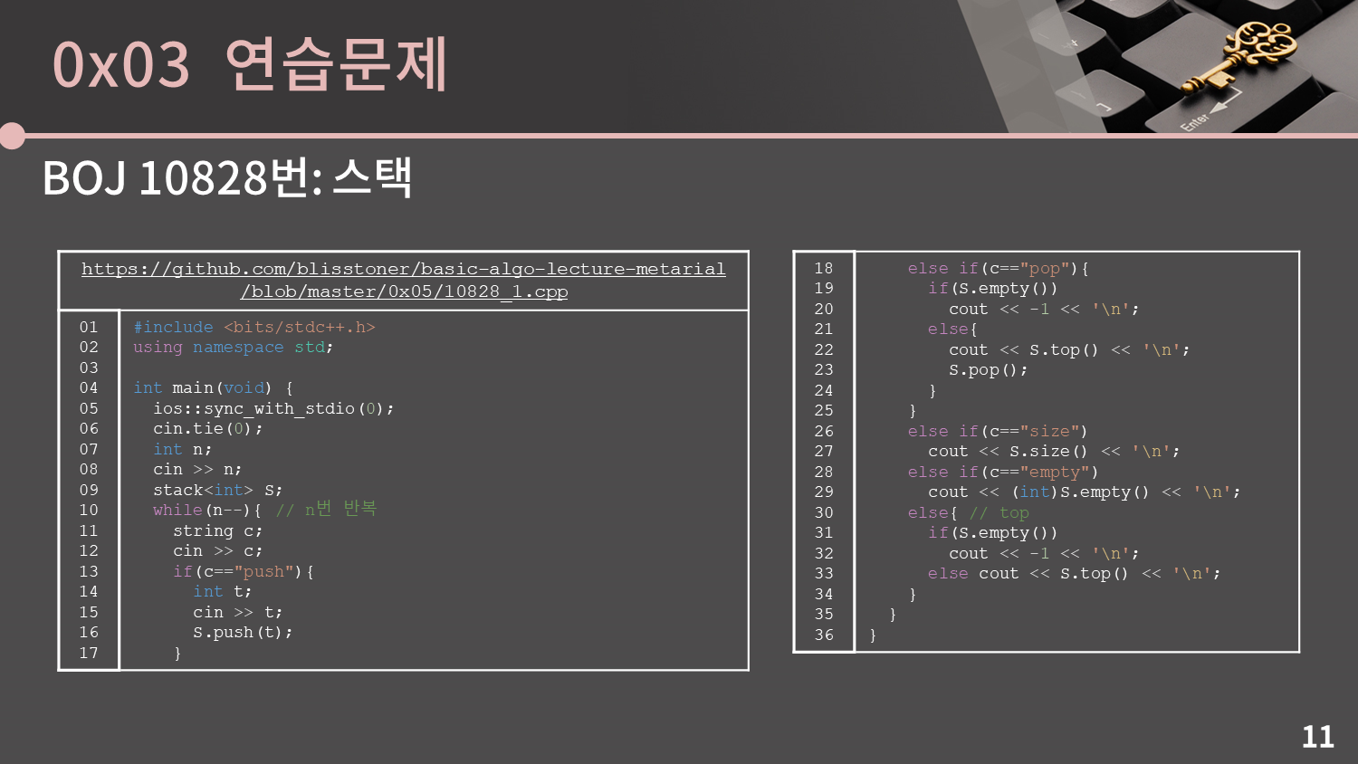 연습문제들에는 스택을 이용해서 풀 수 있는 문제들을 넣어뒀는데 10773번은 그럭저럭 풀만하지만 나머지 문제들은 다소 생소할 발상을 필요로 하기 때문에 좀 많이 어려울 것입니다. 그래서 10773번을 제외한 나머지 문제들은 어렵다 싶으면 굳이 얽매이지말고 일단 넘어가셨다가 BFS/DFS를 다룬 후에 보셔도 괜찮습니다.
