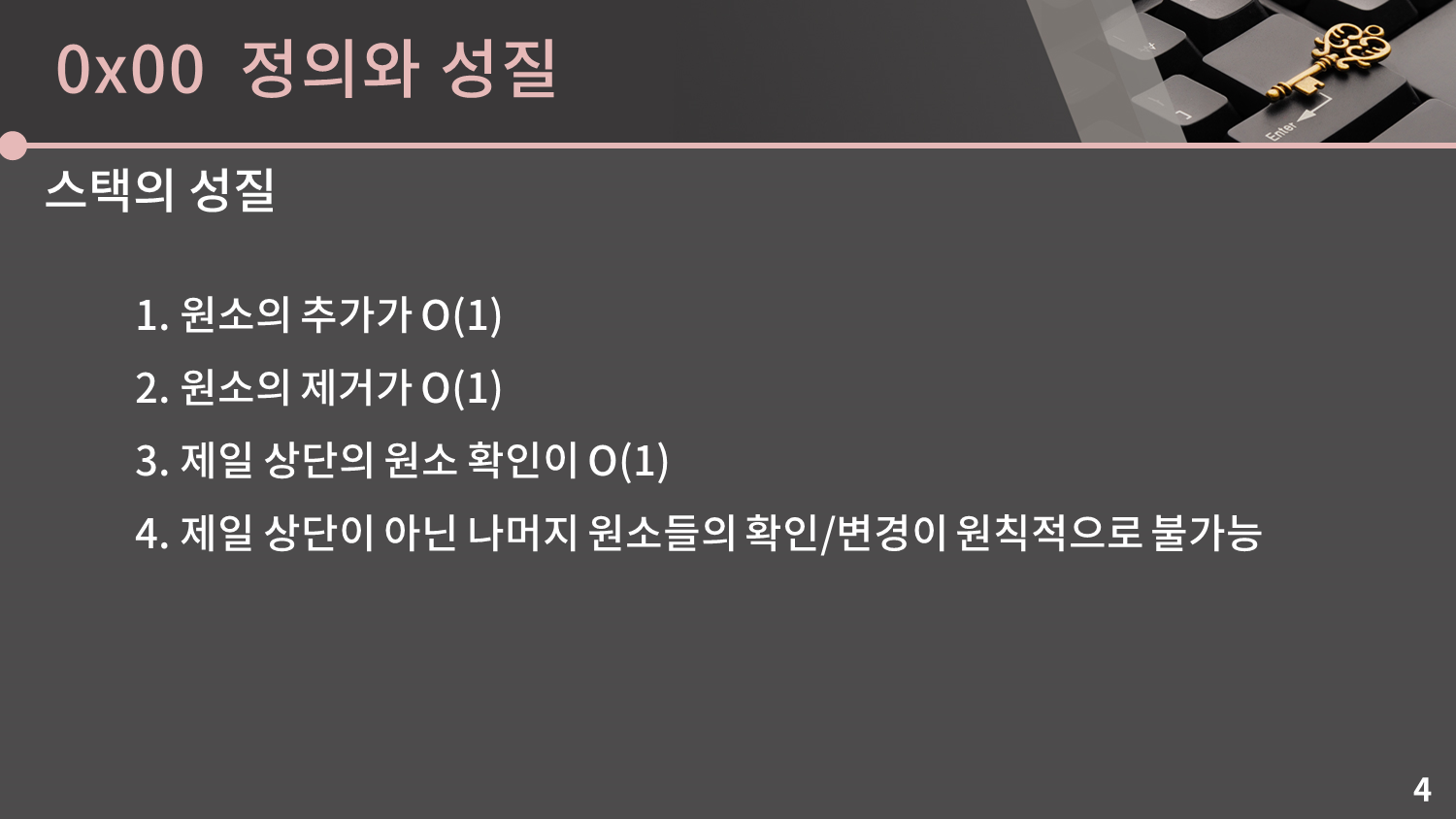 스택은 특정 위치에서만 원소를 넣거나 뺄 수 있게 제한을 둔 대신에 원소의 추가와 제거가 모두 O(1)입니다. 나중에 구현을 같이 해보겠지만 우리가 배열의 끝에서 원소를 추가/제거할 때 시간복잡도가 O(1)이었던 것과 완전 상황이 똑같습니다. 그리고 제일 상단의 원소 확인 또한 O(1)입니다.
