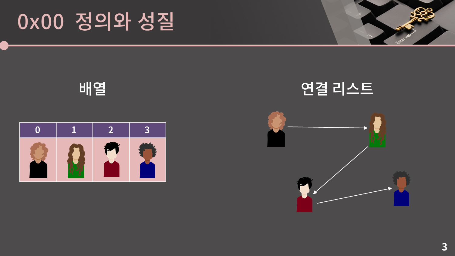 자 그러면 연결 리스트의 성질이 어떤지를 한 번 보겠습니다. 배열과 연결 리스트를 비교하는 경우가 많기 때문에 배열에서는 어땠는지를 떠올리면서 봐도 좋습니다.