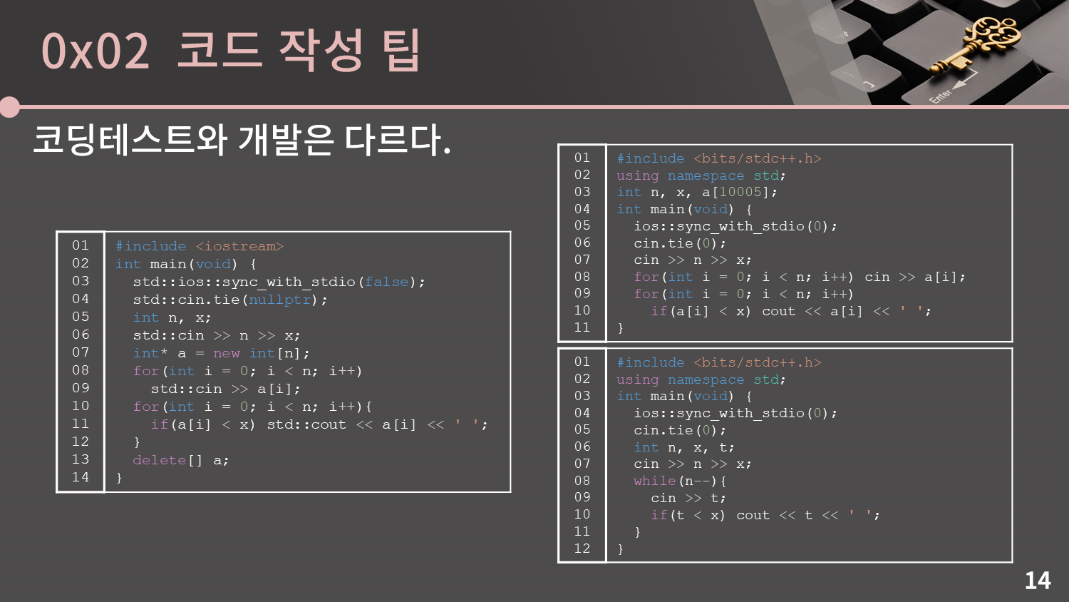 왼쪽같은 코드를 선호하시는 분들은 기겁을 하실 수도 있습니다. 또 현업이었다면 코드리뷰에서 대차게 까일 것입니다. "아니 cin/cout만 쓰면서 온갖 헤더를 다 include할거야?", "sync_with_stdio는 bool 자료형을 인자로 받는데 왜 0을 넣어?", " 왜 전역에 다 때려박아?", "배열 크기는 왜 5를 더 크게 받았어?" 등등...
