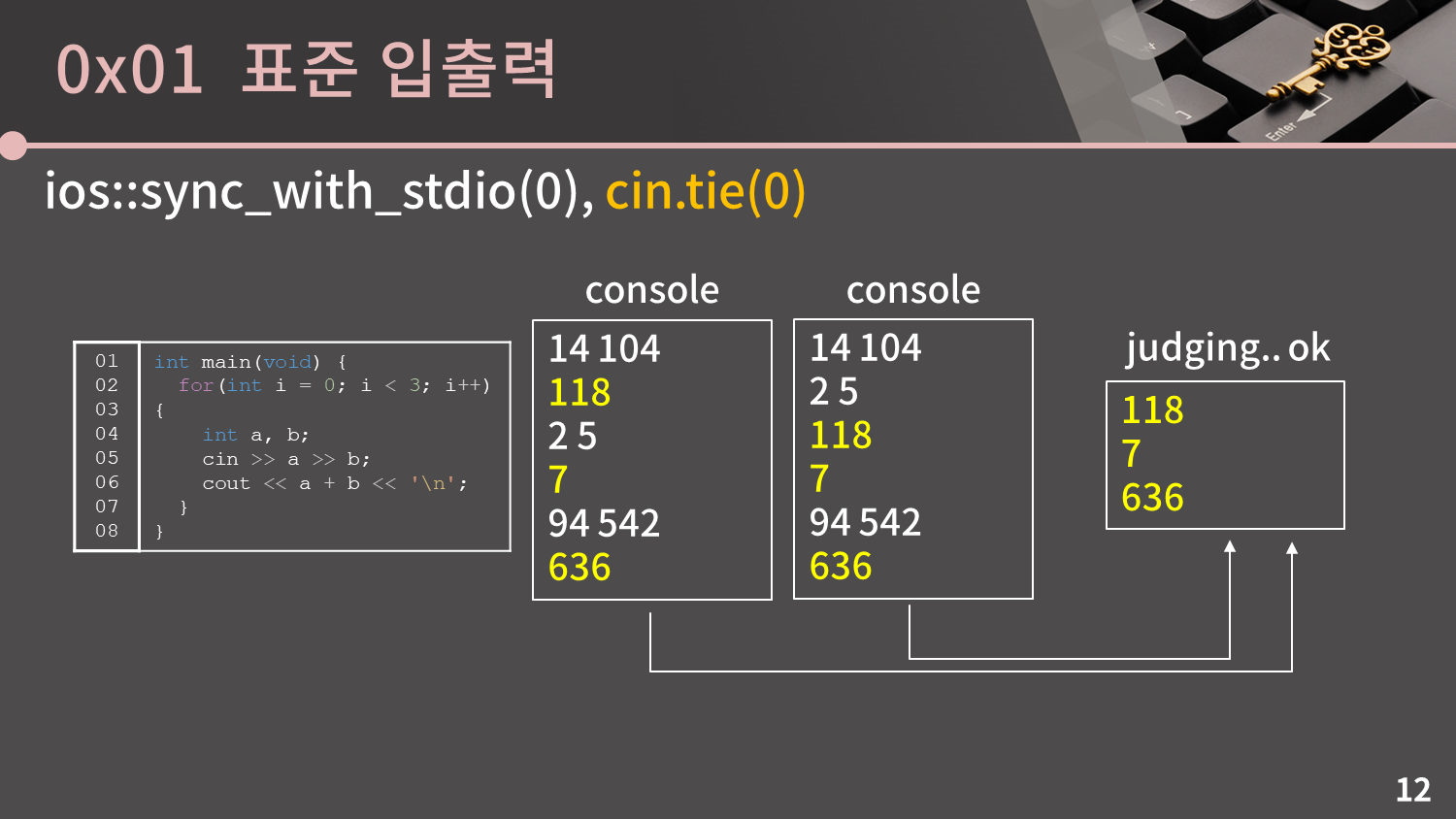 sync_with_stdio, cin.tie 명령에 대해 설명을 드렸는데 잘 이해가 안가면 cin/cout을 쓸 땐 반드시 저 두 명령을 넣어줘야한다고만 받아들이고 넘어가도 됩니다. 그리고 sync_with_stdio를 쓴 이후로는 무조건 cin/cout만 쓰고 printf/scanf를 쓰면 안된다는 것도 꼭 기억하셔야 합니다.