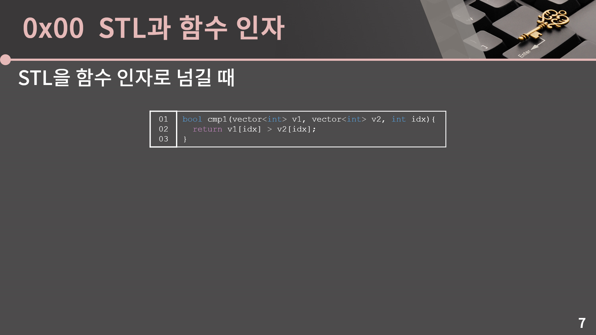 그냥 STL을 쌩으로 함수 인자에 넣으면 복사해서 보낸다는걸 꼭 유의하셔야 합니다. 이 사실을 머릿속에 넣어두고 cmp1 함수를 한 번 확인해봅시다.