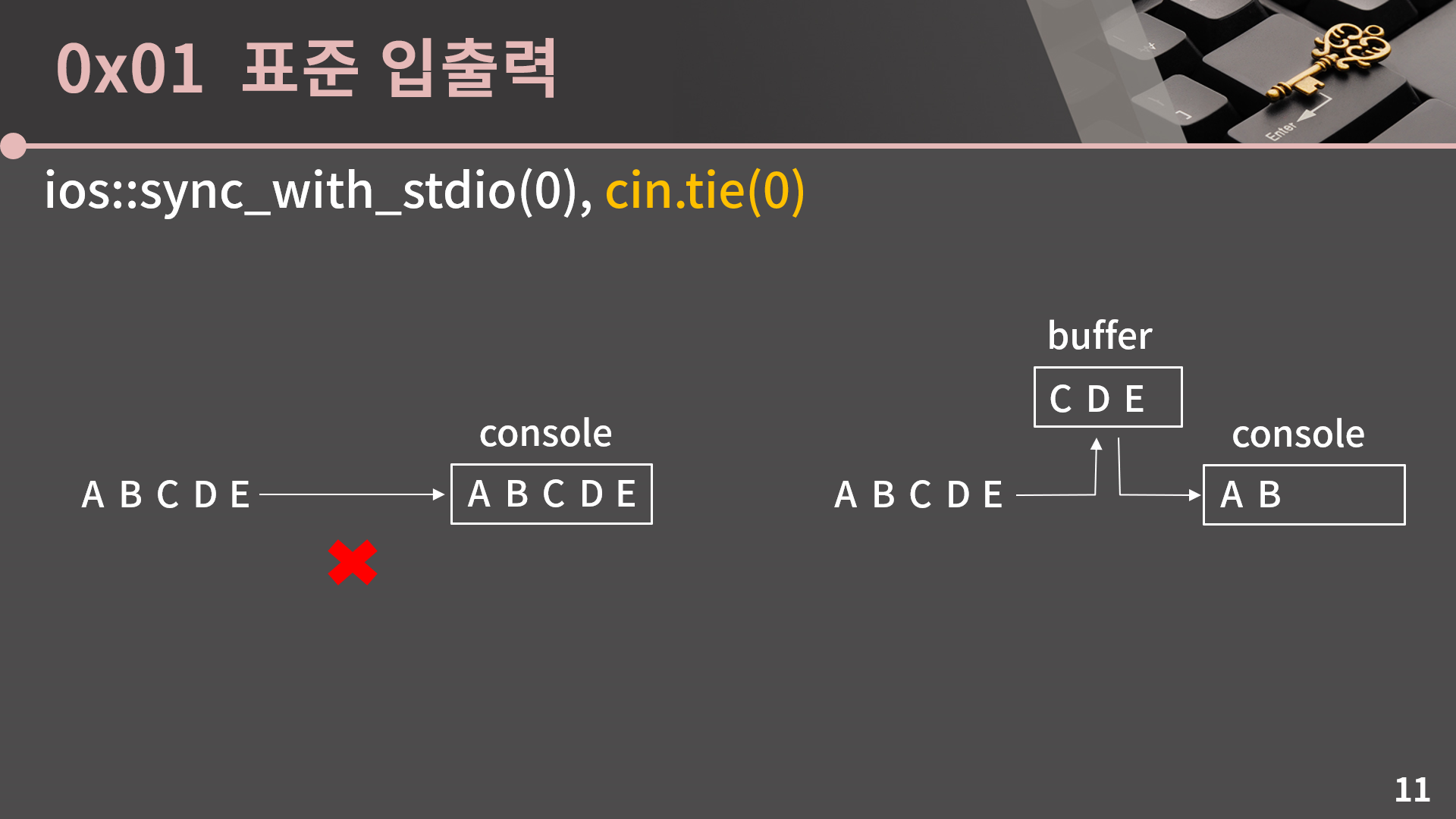 두 번째 명령인 cin.tie(0)을 이해하려면 버퍼라는 개념을 이해해야 합니다. 그런데 버퍼가 각 잡고 강의하면 거의 30분은 들여서 설명해야 할 개념이어서 아쉽지만 좀 간략하고 두리뭉실하게 설명을 해야할 것 같습니다.