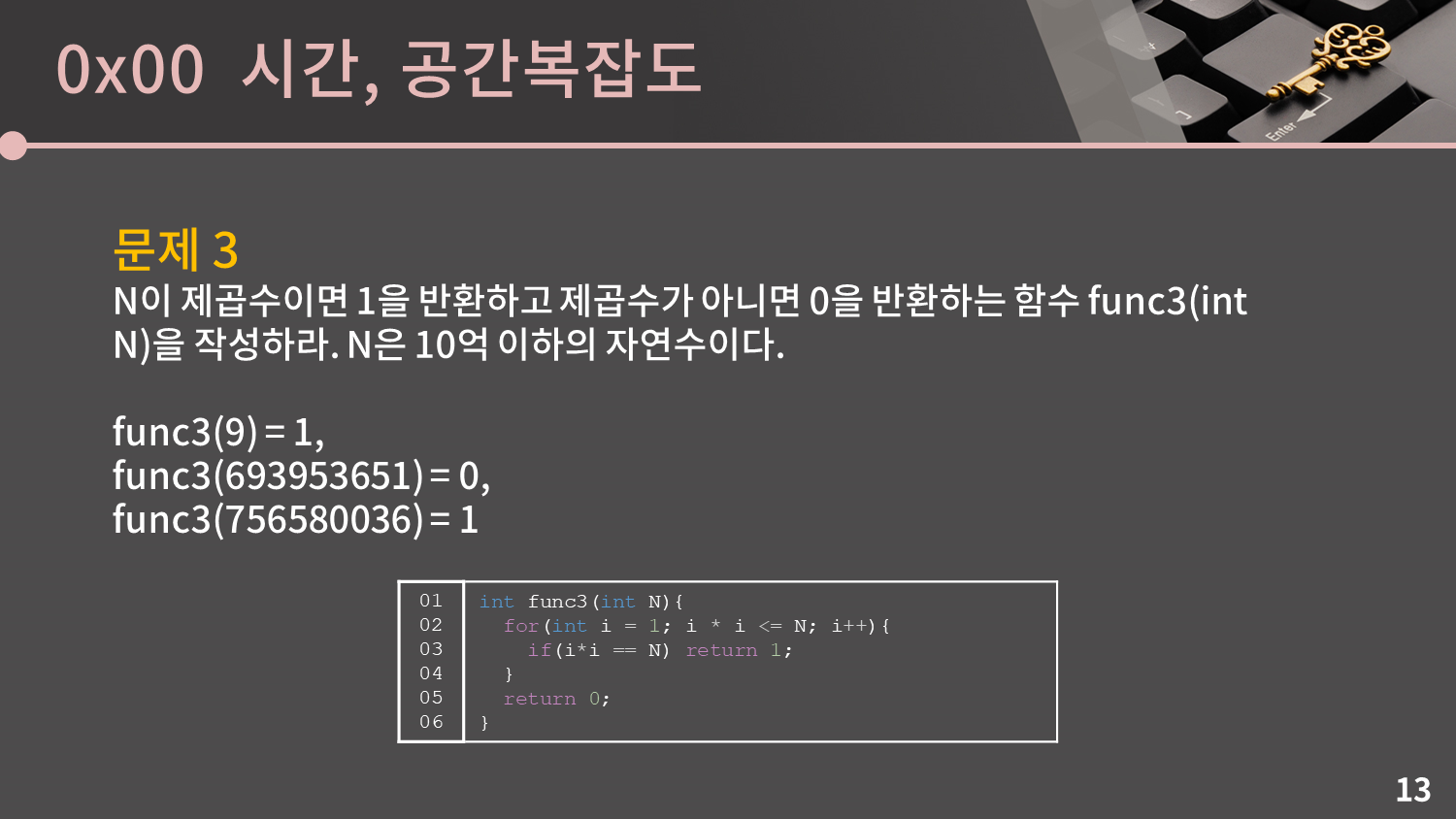 이 방식의 시간복잡도는 얼마일까요? 생각해보면 i가 1부터 2, 3 이렇게 가다가 최대 √N까지 올라갈테니 시간복잡도는 O(√N)이 됩니다. 이렇게 시간복잡도에 루트가 들어갈 수도 있습니다.