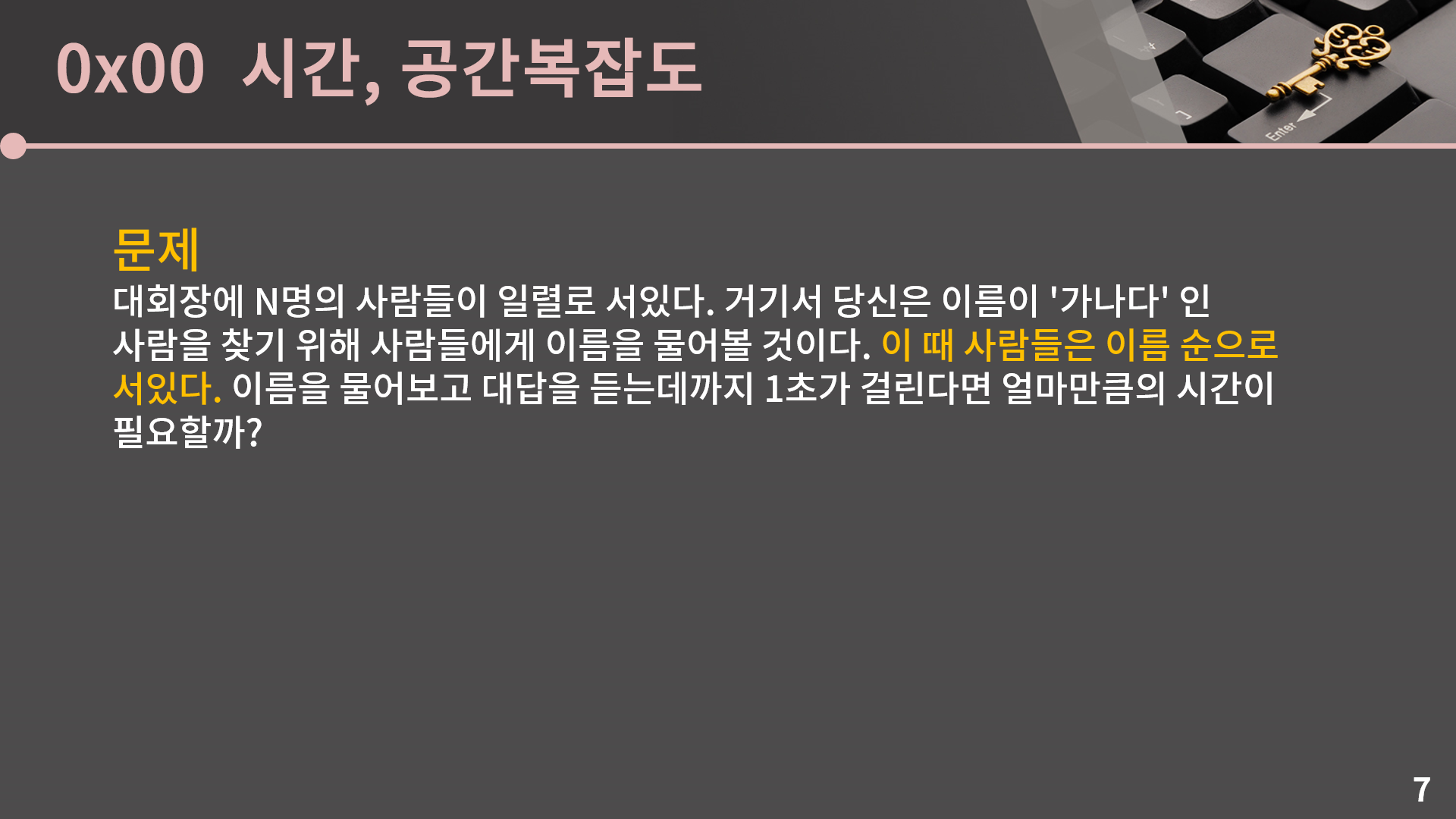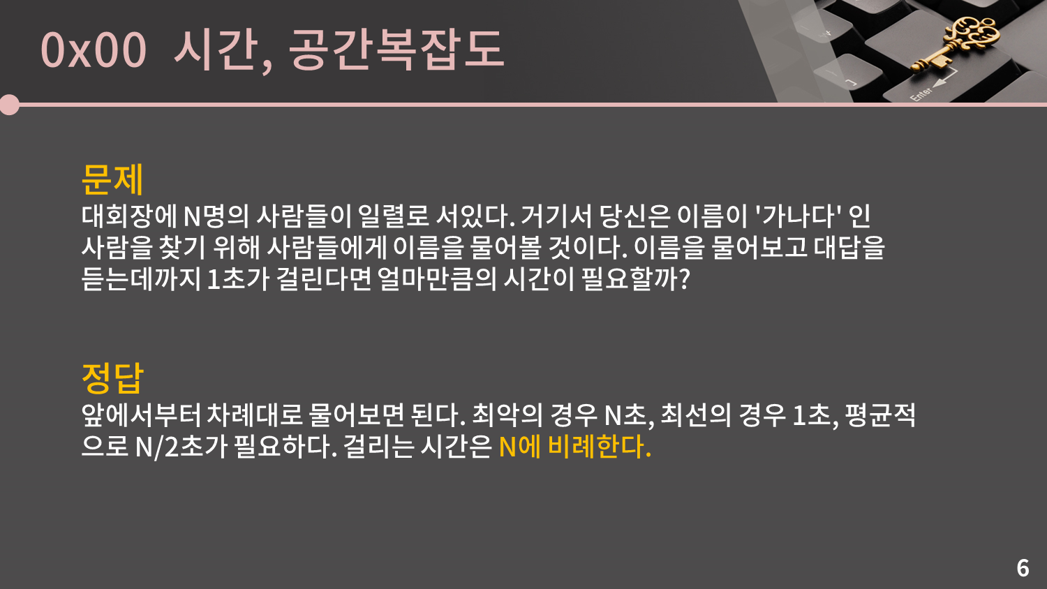 크게 어렵지는 않은 문제같은데 어떤가요? 맨 앞으로 나간 후에 사자후를 질러서 한 번에 찾는다 이런 넌센스 답을 제외하면 방법은 굉장히 뻔합니다. 그냥 맨 앞부터 한 명 한 명 붙잡고 '가나다'씨가 맞는지 물어보면 됩니다. 운이 좋으면 물어보자마자 바로 찾을테니 1초이고, 최악의 경우는 '가나다'씨가 맨 뒤에 있을 경우 모든 사람에게 다 물어봐야 하니 N초이고, 평균적으로는 대충 절반쯤 물어보면 '가나다'씨를 찾을 수 있을테니 N/2초입니다.