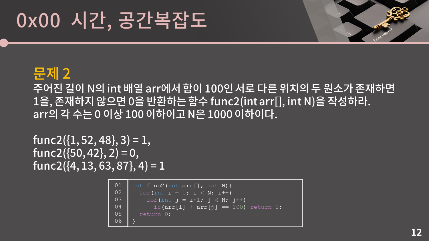 혹시 나는 O(N) 짜리 풀이를 짰는데 이 사람은 왜이리 비효율적으로 짰지? 라고 생각하시는 분 있으신가요? 있으시다면 아주 칭찬합니다. 사실 이 문제는 딱 봤을 때 O(N²) 풀이가 먼저 떠오르지만 O(N)짜리 풀이가 존재합니다. 하지만 지금 짚고 넘어가지는 않고 0x03강에서 배열에 대해 배울 때 알려드리겠습니다. 지금은 여기 슬라이드에 있는 코드만 이해하시고 또 이 코드가 O(N²)라는 것만 이해해도 충분합니다.