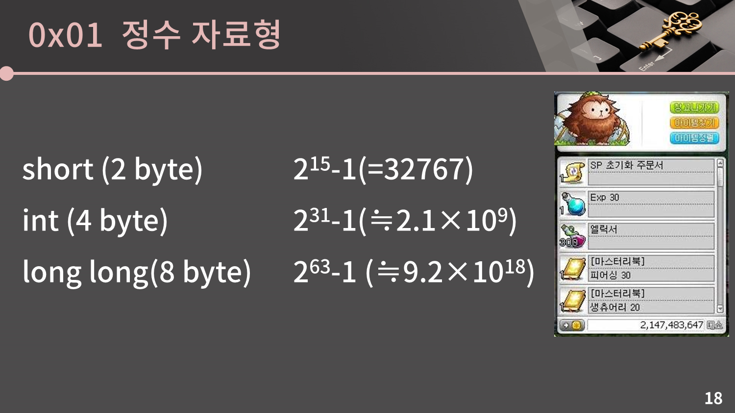 저와 동년배들은 저 int의 최댓값인 21억이 살짝 익숙할텐데 요즘은 패치가 됐지만 옛날엔 메이플 최대 메소가 231-1인 2147483647이었습니다.