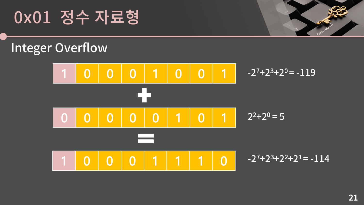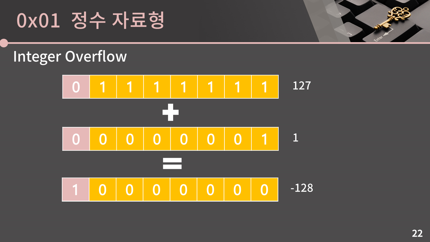 그리고 제일 앞의 칸은 -27의 칸이니 10000000은 -128이 됐습니다. 이렇게 char에서 127+1 = -128이 되는 기적을 같이 목도했습니다. 이게 Integer Overflow의 전부입니다. 컴퓨터는 명령받은 대로 이진수 계산을 했을 뿐인데 다만 그 결과가 옳지 않게 된 것입니다.