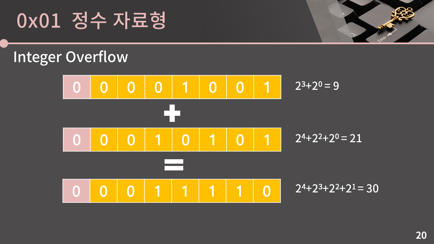 9 + 21 = 30인건 당연하고, 그냥 이진수의 덧셈으로 생각을 해도 1001과 10101을 더하면 11110이 된다는걸 알 수 있습니다.