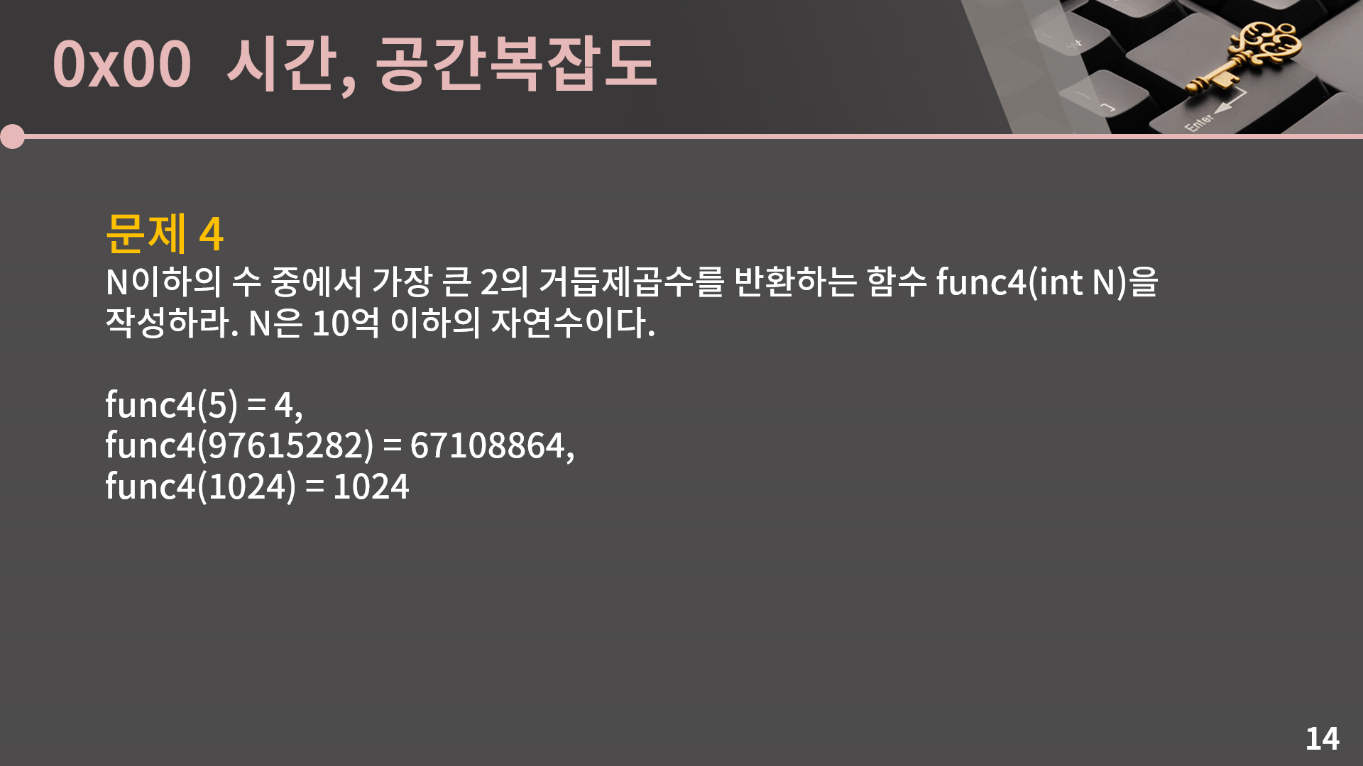 이제 마지막 문제입니다. 마지막 문제는 N이하의 수 중에서 가장 큰 2의 거듭제곱수를 반환하는 문제입니다. 예를 들어 N이 5라고 할 때 5이하의 수 중에서 2의 거듭제곱수는 1, 2, 4가 있는데 셋 중에서 4가 가장 크니 4를 반환하게 됩니다.