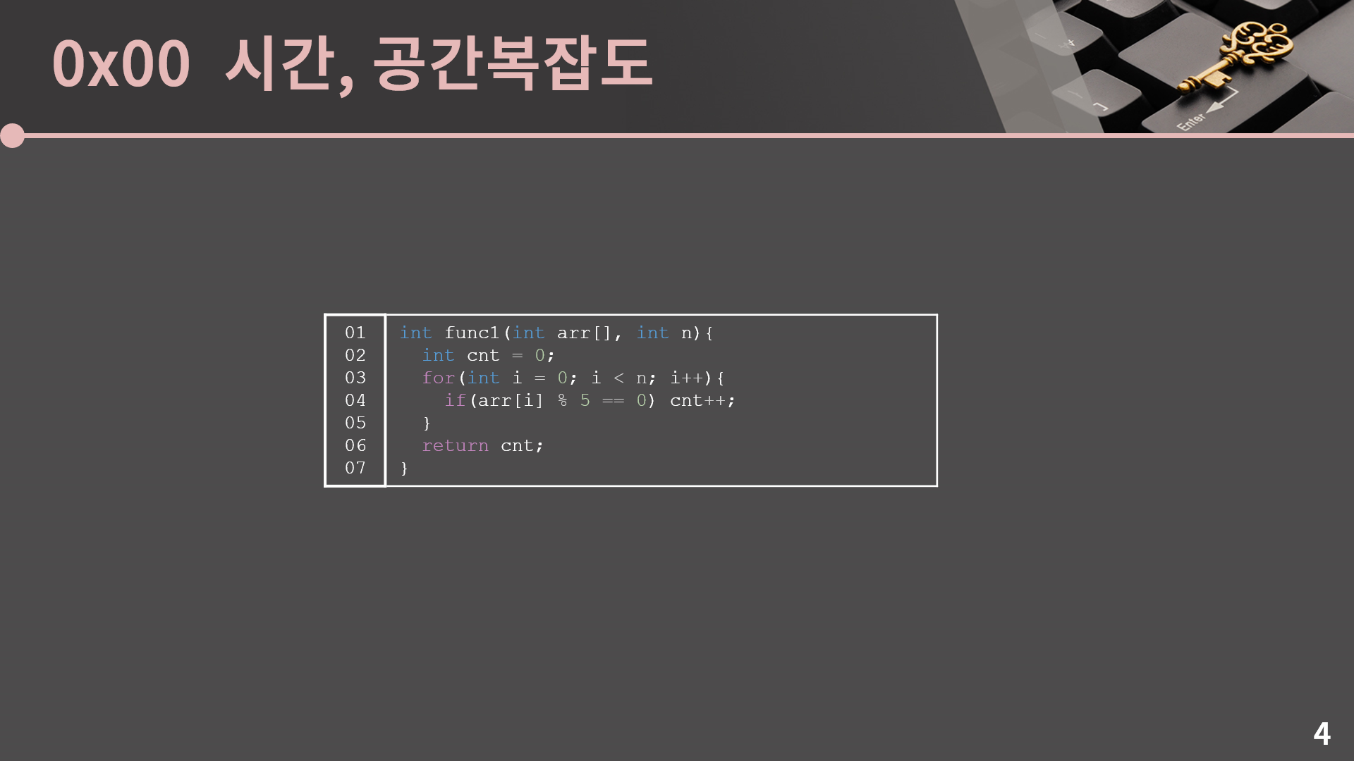 이 사실을 어떻게 빠르게 캐치할 수 있냐면 결국 이 코드는 n개의 수를 훑어보며 5로 나눈 나머지를 계산해보게 됩니다. 그러면 03, 04, 05번째 줄의 for문에서 n번에 걸쳐 5로 나눈 나머지를 확인하고 0과 일치하면 cnt를 증가시키는 행위를 하게 되니 굳이 아까처럼 하나하나 뜯어보며 5n + 3이라는 것을 알아내지 않더라도 n에 비례하겠거니 하고 충분히 생각할 수 있습니다.