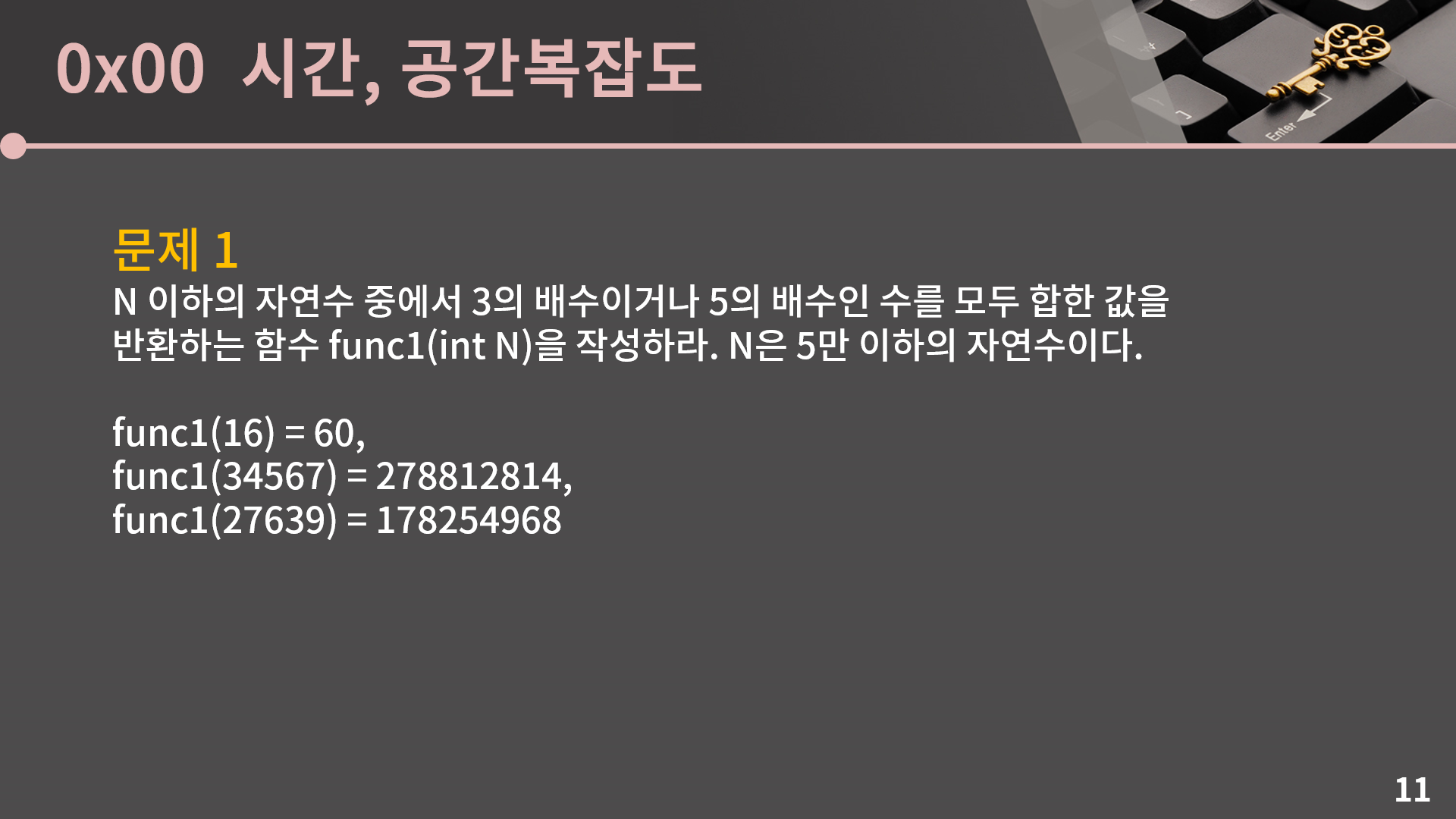 일단 문제를 한 번 봅시다. N 이하의 수 중에서 3의 배수이거나 5의 배수인 수를 모두 합한 값을 반환하는 함수를 한번 구현해봅시다. 예를 들어 N이 16이면 3+5+6+9+10+12+15=60을 반환하면 됩니다. N이 34567, 27639일 때의 값도 드렸으니 다 짠 후에 확인보면 되겠습니다.