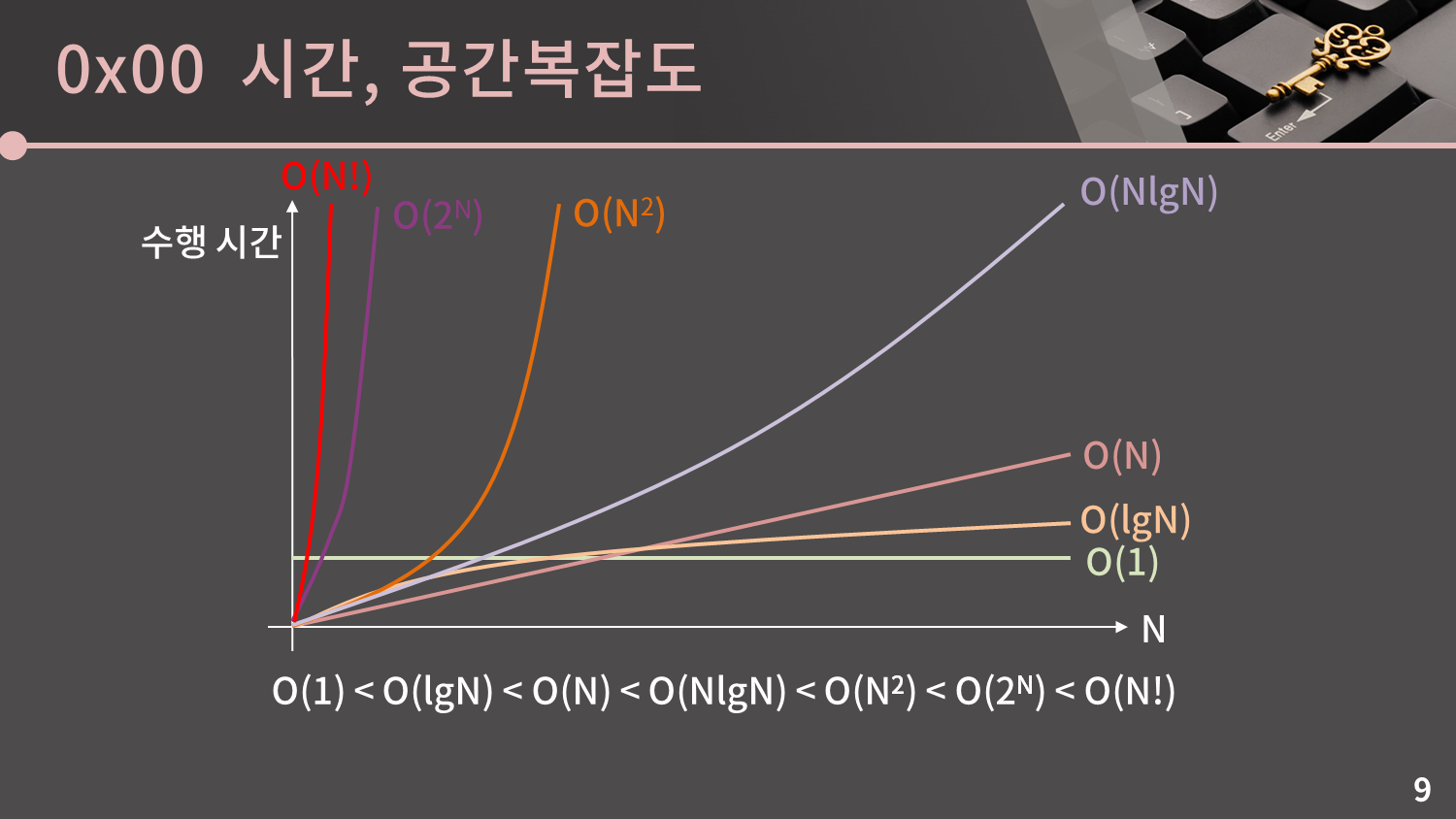 이런 식으로 N의 크기에 따른 허용 시간복잡도를 표로 나타낸 게 본문에 있는 표입니다. 물론 이 기준이 절대적인건 아닙니다. N이 10,000인데도 O(N²)이 통과될 수 있고, 반대로 복잡한 연산이 많은 경우 N이 1,000,000인데도 O(NlgN)이 통과되지 않을 수도 있습니다. 그냥 표를 통해 대략적인 느낌만 가져가시면 됩니다.