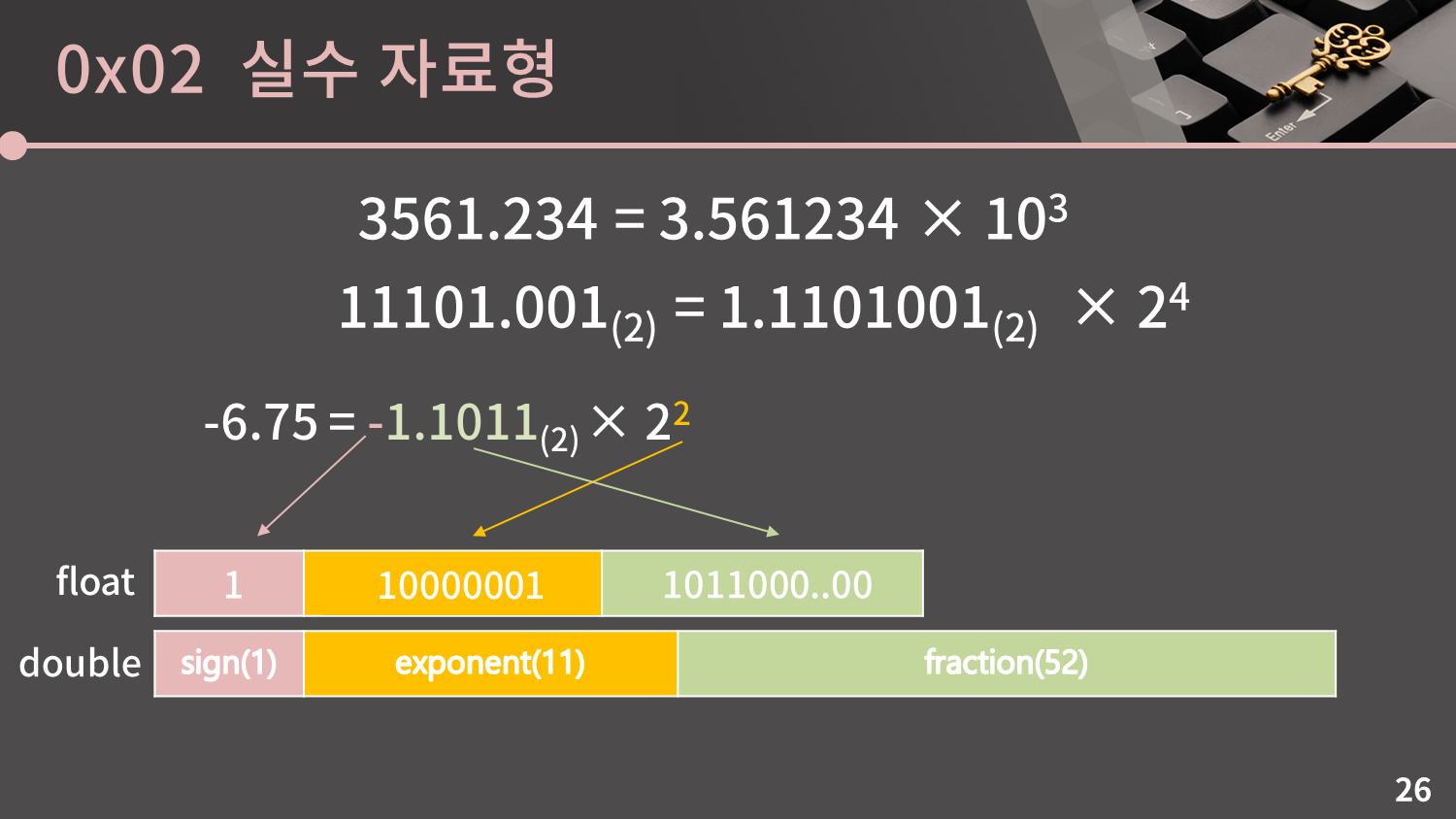 그 다음으로는 2진수에서의 과학적 표기법을 이해해야 합니다. 저희가 10진수에서 편의를 위해 3561.234 = 3.561234 × 103 으로 나타내는 것 처럼 2진수에서도 11101.001(2) = 1.1101001(2) × 24 으로 나타낼 수 있습니다.