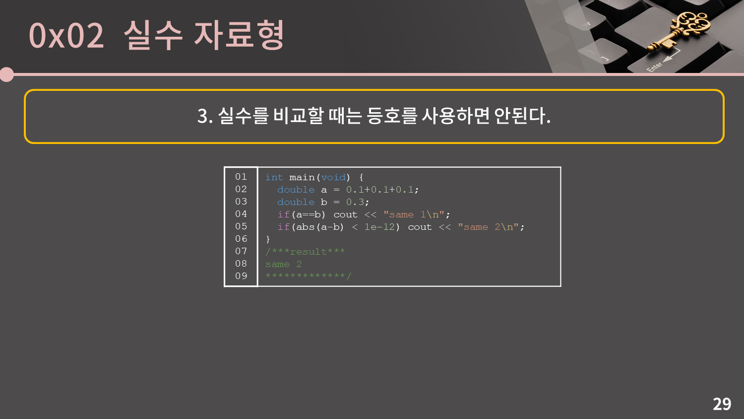 마지막으로 실수를 비교할 때는 등호를 사용하면 안됩니다. 이건 0.1+0.1+0.1과 0.3이 일치하지 않았던걸로 이미 보셨을텐데, 오차 때문에 두 실수가 같은지 알고 싶을 때에는 둘의 차이가 아주 작은 값, 대략 10-12 이하면 동일하다고 처리를 하는게 안전합니다.