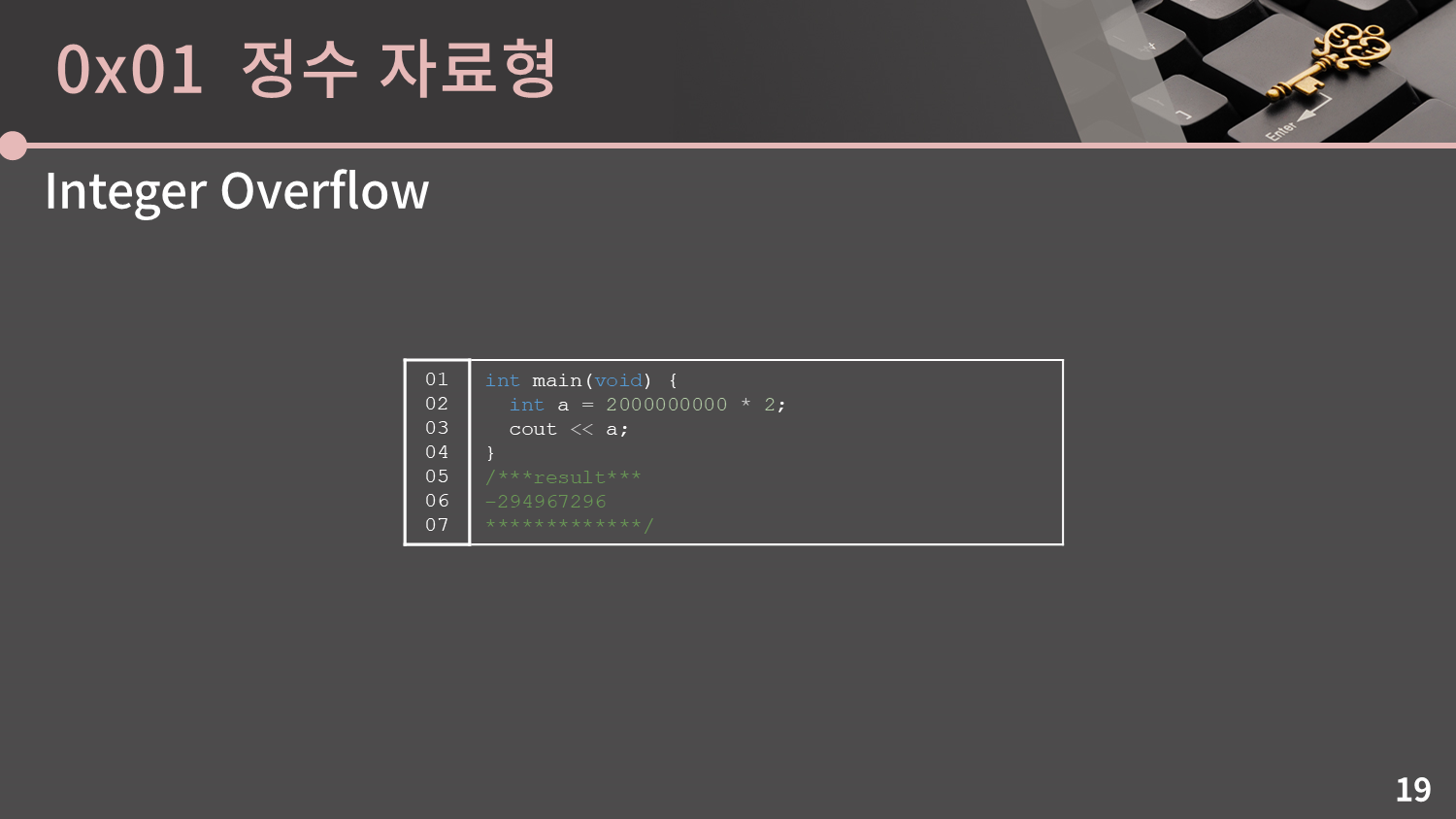 그 다음으로는 Integer Overflow를 알아볼 것입니다. 아마 다들 코딩을 하다가 한 번 쯤은 이런 현상을 겪어보셨을 것입니다. int가 대충 21억까지 표시할 수 있다고 했으니 20억에 2를 곱한 40억을 저장할 수 없는건 알겠는데 -294967296은 대체 어디서 나온 값인지 너무 뜬금없습니다.