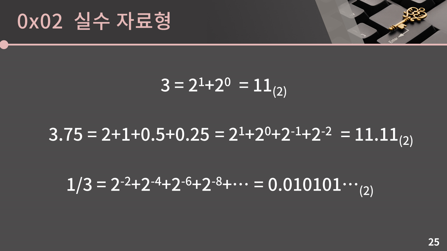 한편, 10진수의 무한소수와 같이 2진수에서도 무한소수가 나타납니다. 예를 들어 1/3은 2-2+2-4+2-6+… 이런 식으로 끝없이 이어지기 때문에 2진수로 나타내면 0.010101… 이 됩니다.