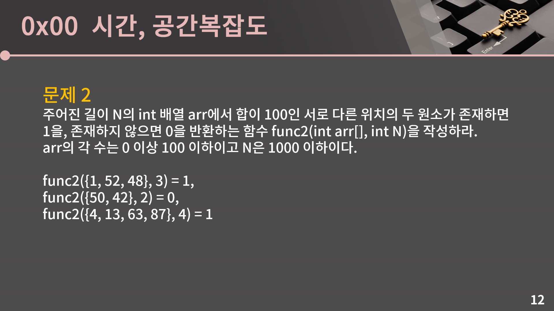 그 다음 문제는 합이 100인 서로 다른 위치의 두 원소가 존재하는지 판단하는 문제입니다. 이것도 구현한 후에 제 코드를 같이 확인하겠습니다. 시간복잡도도 생각해봅시다.