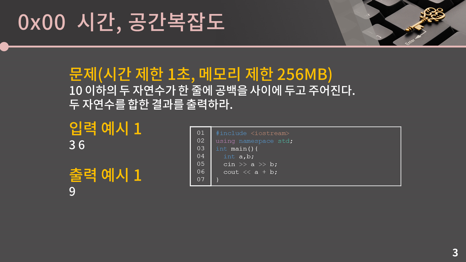 이 문제에서 정답을 받은 코드를 다시 생각해보면 이 코드는 연산을 몇 번 할지 생각해봅시다. 일단 05번째 줄에서 두 변수를 입력받을 때 , 06번째 줄에서 두 수를 더하고 출력할 때 연산이 필요하게 되니 대충 3, 4번의 연산이 필요할 것입니다. 그러니까 1초 내로는 충분히 프로그램이 모든 명령을 수행한 후에 종료되고, 엄밀히 말하면 진짜 0.000001초도 안 걸릴 것입니다.