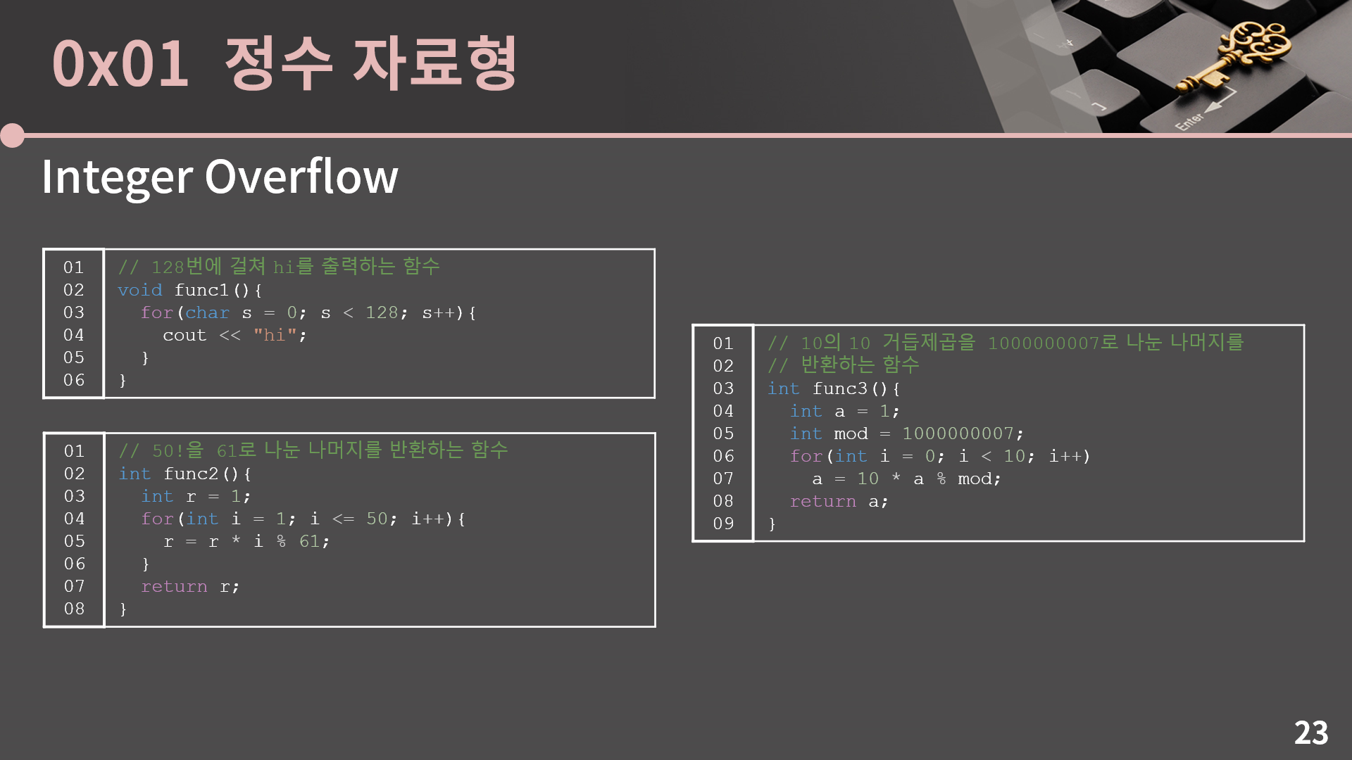 제가 3가지 함수를 보여드릴테니 Integer Overflow가 발생할 수 있는 함수가 무엇인지, 어느 부분에서 발생하는지를 찾아보겠습니다.3개의 함수 중에서 Integer Overflow로 인해 의도한대로 동작하지 않는 함수는 func1과 func3입니다. 우선 func1의 경우에는 s가 127이 된 후에 1이 더해질 때 127에서 1이 더해지면 -128이기 때문에 의도한대로 동작하지 않고 무한루프에 빠집니다. 이를 해결하려면 s의 자료형을 char에서 int로 바꿔야 합니다.