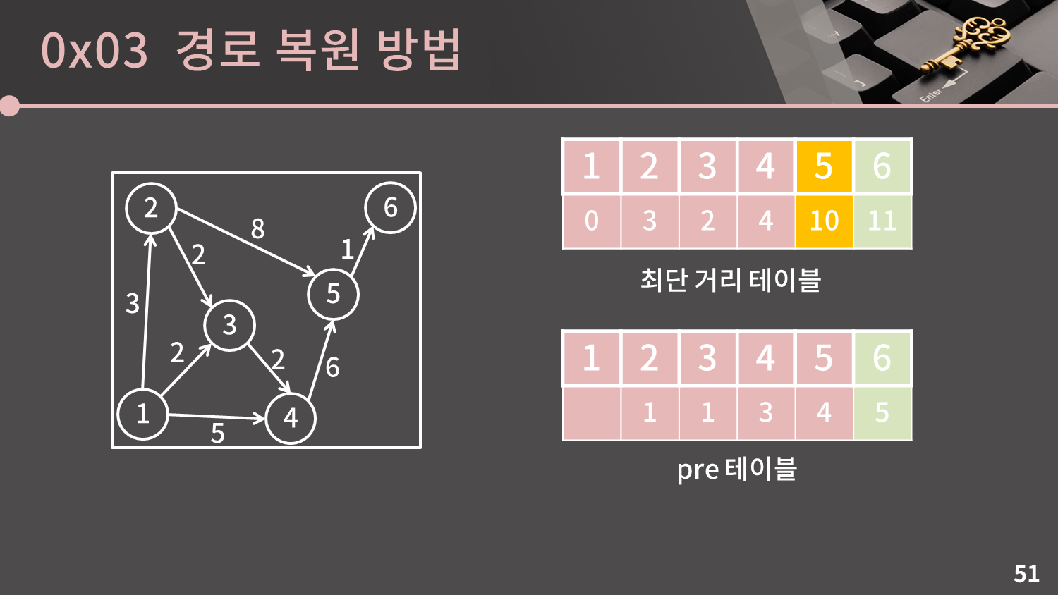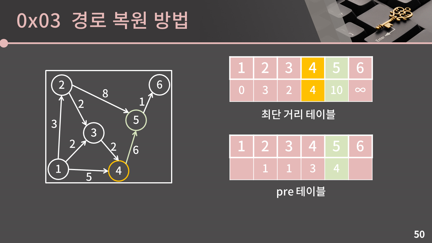 4번 정점이 선택되어 5번 정점의 최단 거리 값이 변경될 때 $pre[5]$에는 4가 기록됩니다.