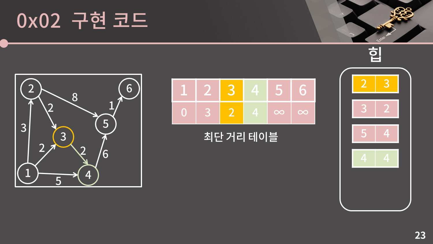 지금 (2, 3), (3, 2)가 조금 혼동을 줄 수 있을 것 같은데 왼쪽이 거리고 오른쪽이 정점의 번호입니다. 즉 힙의 2번째 원소는 거리가 2이고 3번 정점에 관한 원소라는 의미입니다. 헷갈리지 마세요.