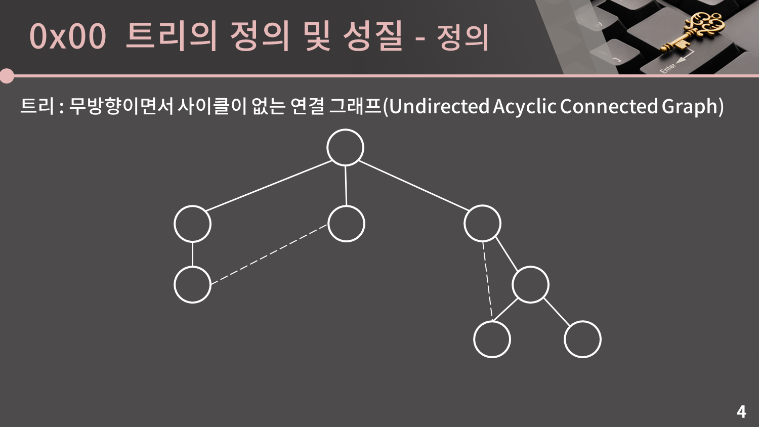 기본적으로 단순 그래프(=루프가 없고 서로 다른 두 점을 연결하는 간선이 최대 1개인 그래프) 상황을 가정합니다. 이 때 트리는 무방향이면서 사이클이 없는 연결 그래프로 정의됩니다.