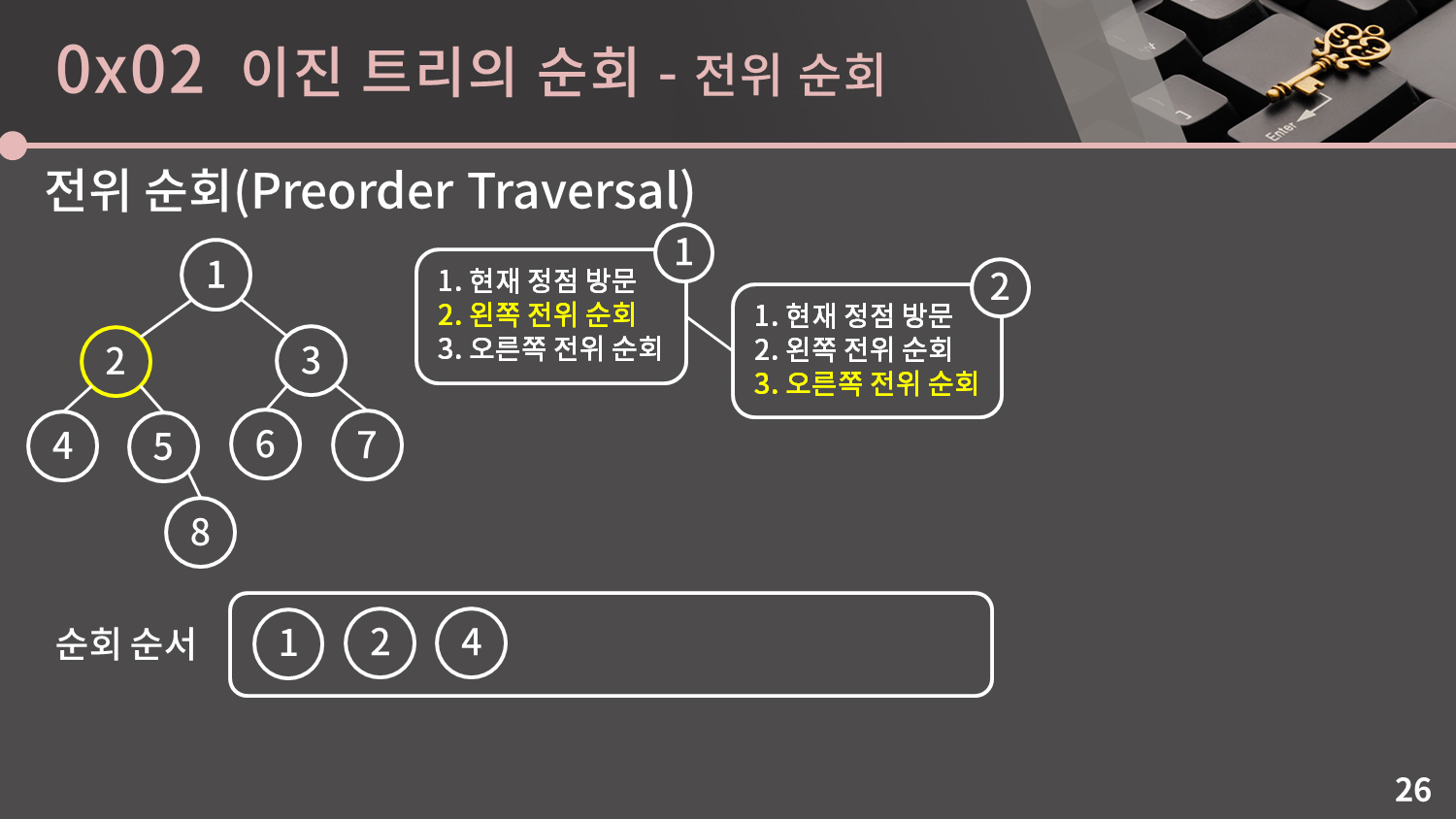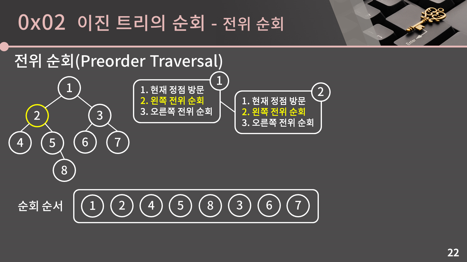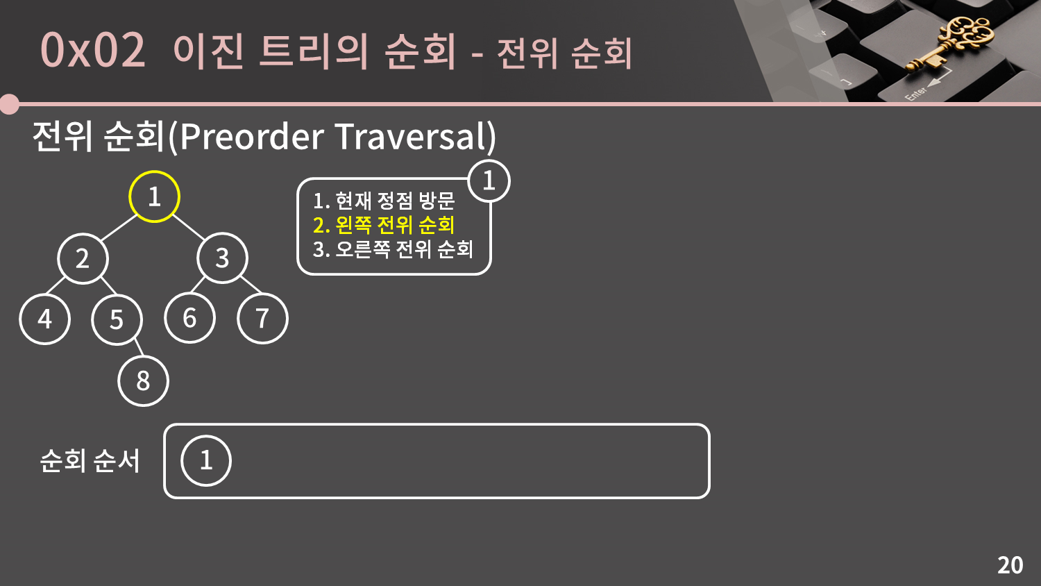 2를 루트로 하는 트리로 넘어와 전위 순회를 다시 시작합시다. 현재 정점인 2를 방문합니다.