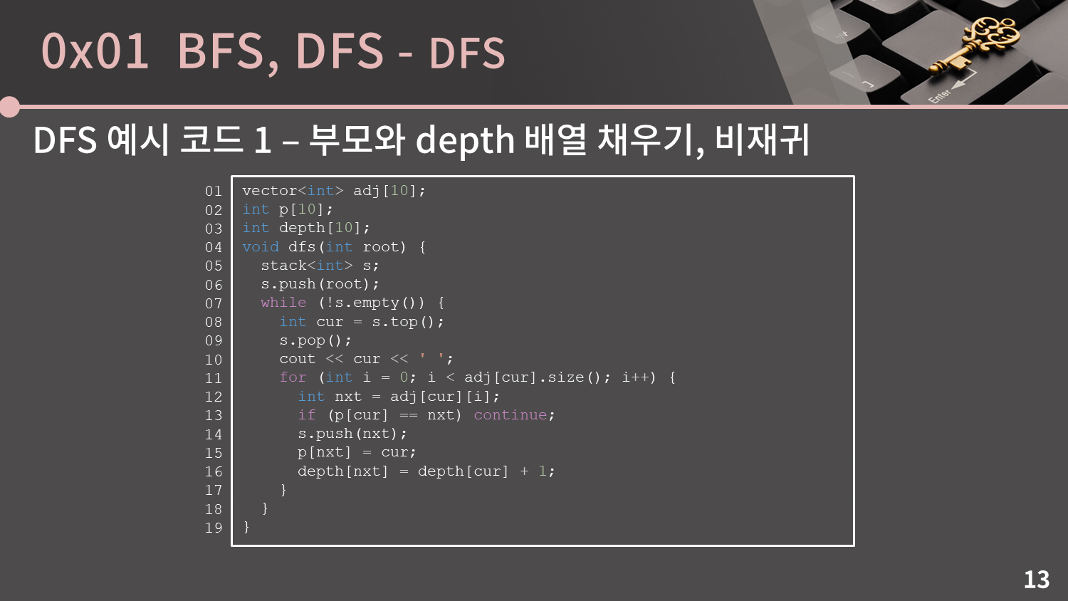 BFS와 비슷하게 자신과 연결된 정점들은 1개만 부모이고 나머지는 전부 자식이라는 성질을 이용해 vis 배열을 쓰는 대신 부모 배열과 depth 배열을 채우면서 처리가 가능합니다. 코드를 참고해보세요.