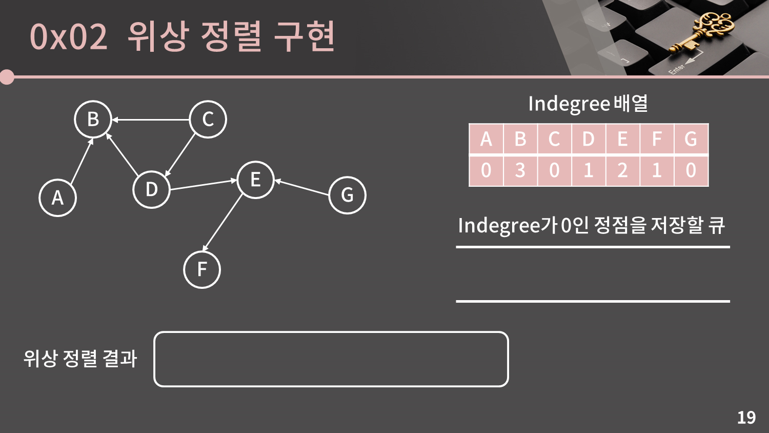 큐의 front에 있는 B를 가져와 위상 정렬 결과에 추가합니다. 정점 B를 "관념적으로" 지울 것인데 B로부터 연결된 정점이 없으므로 Indegree의 값은 변화하지 않습니다.