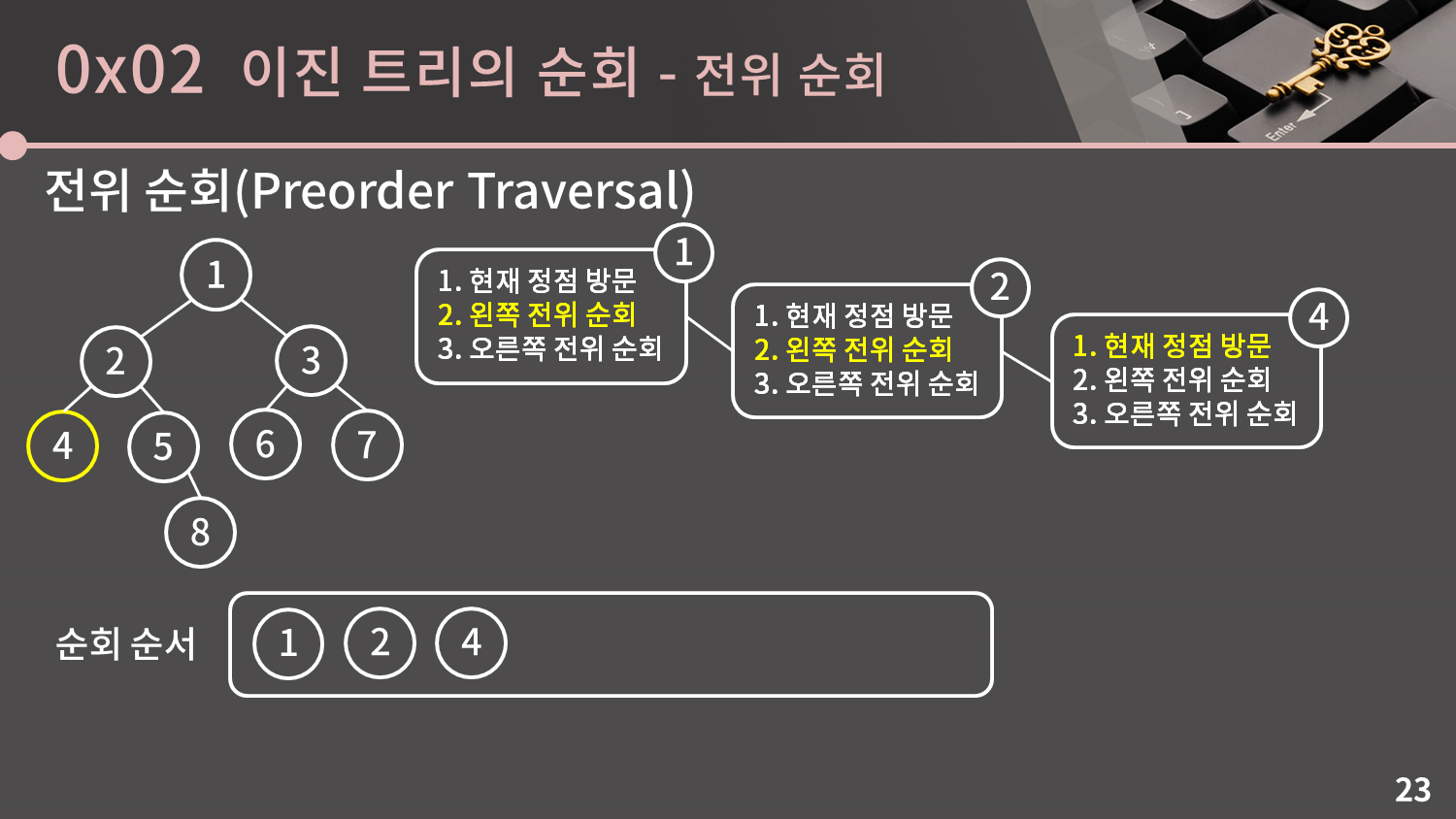 그 다음에는 왼쪽 서브 트리를 전위 순회해야 합니다. 2의 왼쪽 서브 트리는 4를 루트로 하는 트리입니다.