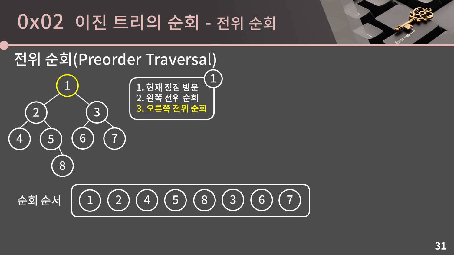 3. 오른쪽 서브 트리를 전위 순회한다.