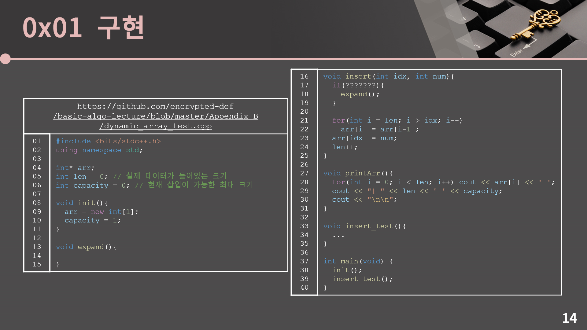 배열 단원에서 했던 것과 약간은 비슷한데, 큰 차이는 배열이 동적 배열이 됐고 그리고 capacity라는 새 변수가 생겼습니다. capacity는 arr 배열이 점유하고 있는 크기를 의미합니다. 다르게 표현하면 삽입이 가능한 최대 크기입니다. 그리고 이전에는 길이를 신경쓰지 않고 그냥 막 insert 함수에서 삽입을 처리하는 12번째 줄에서 15번째 줄의 코드를 실행시키면 됐는데 이번에는 그렇지가 않고 어떤 조건이 만족되면 배열을 확장해줘야 합니다. 그 조건은 08번째 줄에 잘 채워넣으면 되고, 또 확장을 어떤 식으로 해야할지는 expand 함수에 구현을 해보면 됩니다. 실제 깃헙 링크에 들어가서 insert_test 함수를 보면 거기에 삽입이 발생할 때 마다 len, capacity 값이 어떻게 되는지를 적어놔서 상황을 이해하는데에 도움이 될 수도 있습니다. 다음 슬라이드에 바로 답이 나옵니다.