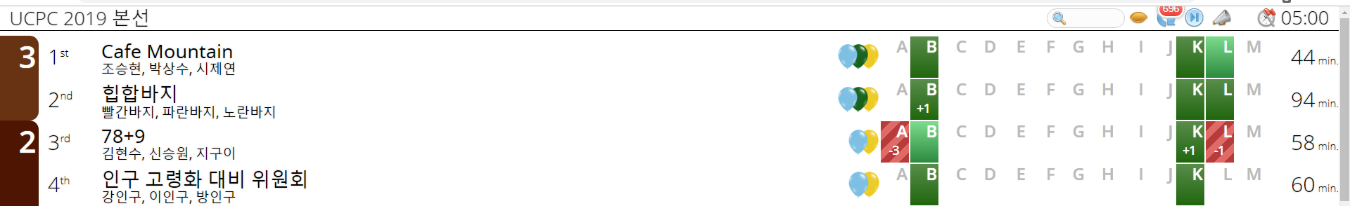 다만 문제의 난이도 조절에서는 참가자 입장에서 아쉬운 점이 많았습니다. 마의 GHIJ 구간에서 2문제 정도는 덜어내고 좀 더 쉬운 문제로 출제했다면 좀 더 스코어보드가 예쁘지 않았을까 싶네요.