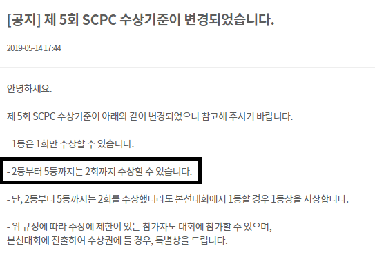 ㅜㅜㅜㅜ 5등상을 2번 탔던 저로서는 변경된 기준에서 가장 큰 손해를 보는 사람이었습니다. 아무튼 이 규정으로 인해 의도치않게 굉장히 편안한 마음으로 대회에 임할 수 있었습니다. 정말 심각하게 말리는게 아니고서야 특별상을 못받을 것 같지는 않았고, 설령 못받는다고 해도 그게 크게 압박이 될 것 같지는 않았습니다.