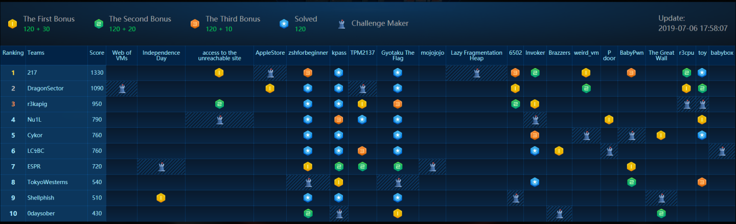그러나 정작 TokyoWesterns들이 출제한 두 문제 zshforbeginner, Gyotaku The Flag 모두 의도하지 않은, 말도 안되게 간단한 취약점이 있어서 1일차에는 kpass, zshforbeginner, Gyotaku The Flag만 주구장창 풀렸습니다. 저희 팀은 zshforbeginner, kpass를 첫 날 풀어내지는 못했지만 jinmo123님이 The Great Wall이라는 문제를 쓱싹해버리셨습니다.