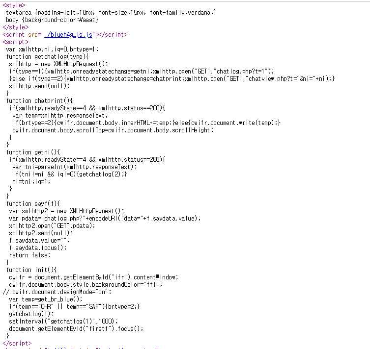 코드를 보면 chatlog.php?t=1, chatview.php?t=1&ni=@@ 이 주소에 접근을 하는 것을 알 수 있습니다. chatlog.php?t=1에서는 현재 보내는 메시지의 값을 주고, chatview.php?t=1&ni=@@는 @@번째 이후의 메세지들을 출력해주는 것 같습니다.