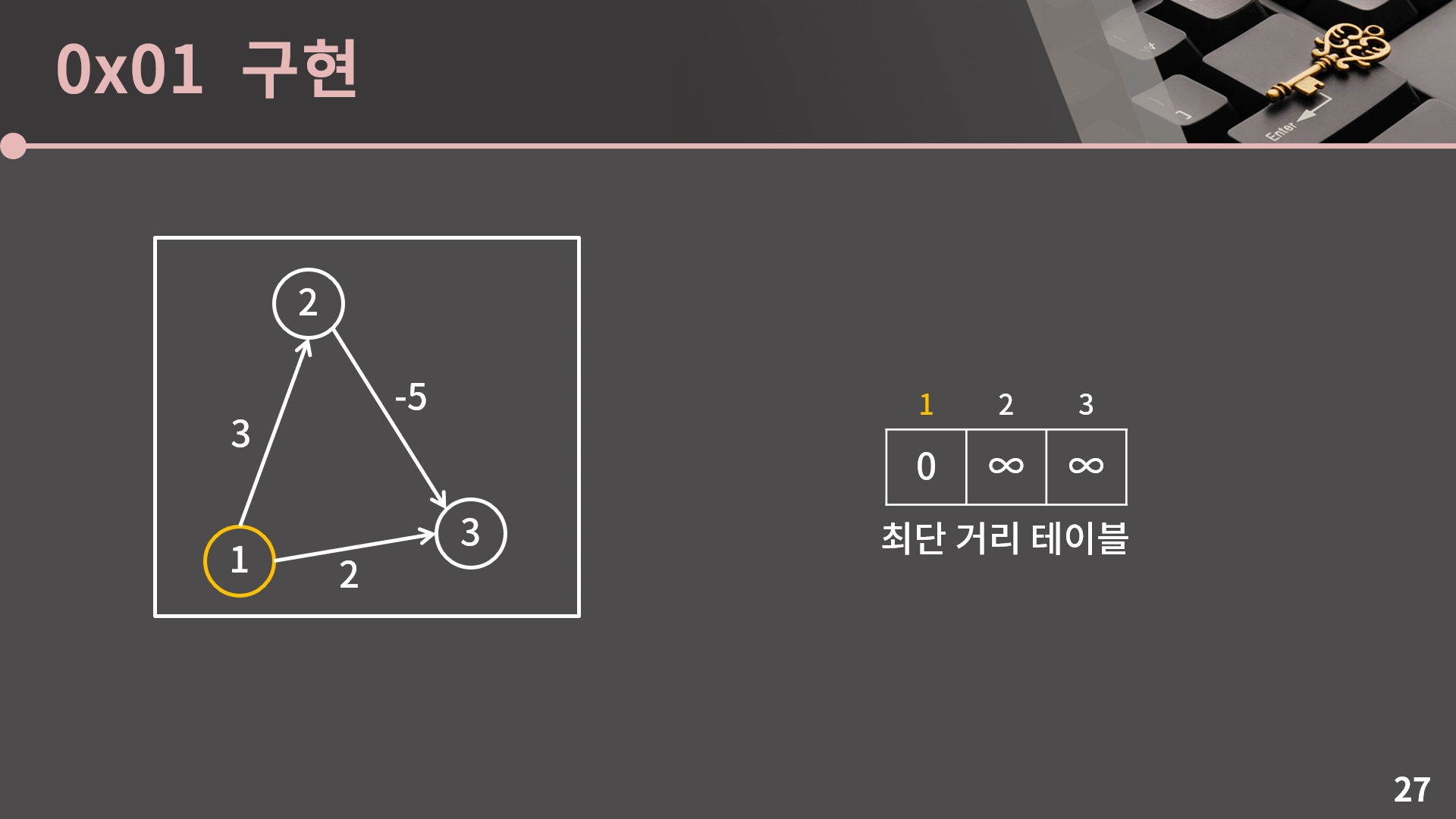 단, 플로이드 알고리즘은 음수인 간선이 있는건 상관이 없고 음수인 사이클이 있을 때에만 문제가 발생했지만 다익스트라 알고리즘은 음수의 가중치를 가지는 간선이 있으면 아예 사용을 할 수가 없습니다. 음수인 간선이 있는데 하나의 시작점으로부터 다른 모든 정점까지의 최단 거리를 구하고 싶다면 벨만포드 알고리즘이란걸 쓰면 되긴 하지만 이 강의에서는 다루지 않을 내용이라 대회까지 염두에 두시는 분이라면 별도로 공부를 하셔도 됩니다. 그렇지 않다면 굳이 벨만포드까지 알아볼 필요는 없습니다.