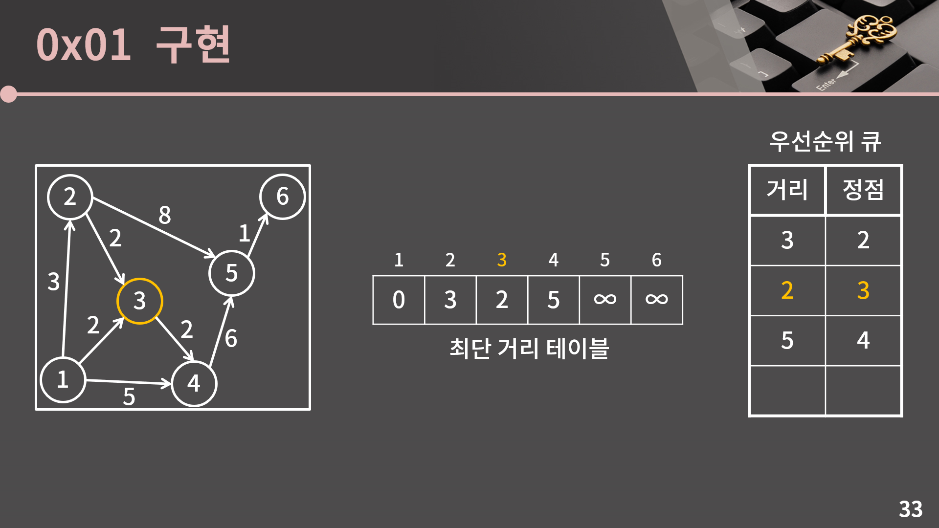 우선순위 큐가 비어있지 않기 때문에 우선순위 큐에서 가장 거리가 작은 원소를 선택합니다. 지금은 (3, 2)가 선택됩니다. 우선 d[2] = 3인지 확인하고, 맞기 때문에 과정을 이어갑니다.